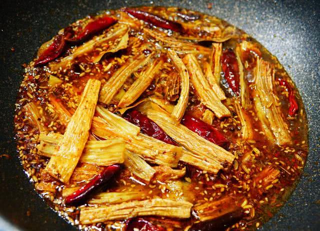 6、锅中倒入煎炸好的腐竹,然后快速翻炒均匀,让每一块腐竹都入味均匀,最好让每一块腐竹都裹上辣椒。如果觉得锅中太干的话,可以再加上一个步骤,可以加入适量的热水,然后中火收汁。