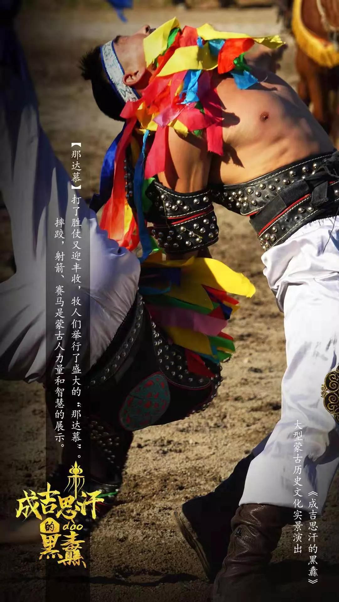 剧情穿插了蒙古文化的多种元素,狩猎,摔跤,射箭,马术,萨满,马头琴,那达慕,诈马宴等,让观众更直观的了解蒙古文化。整场演出50分钟,全部由来自蒙古国的近百名身怀绝技的演员和战马倾情演绎。