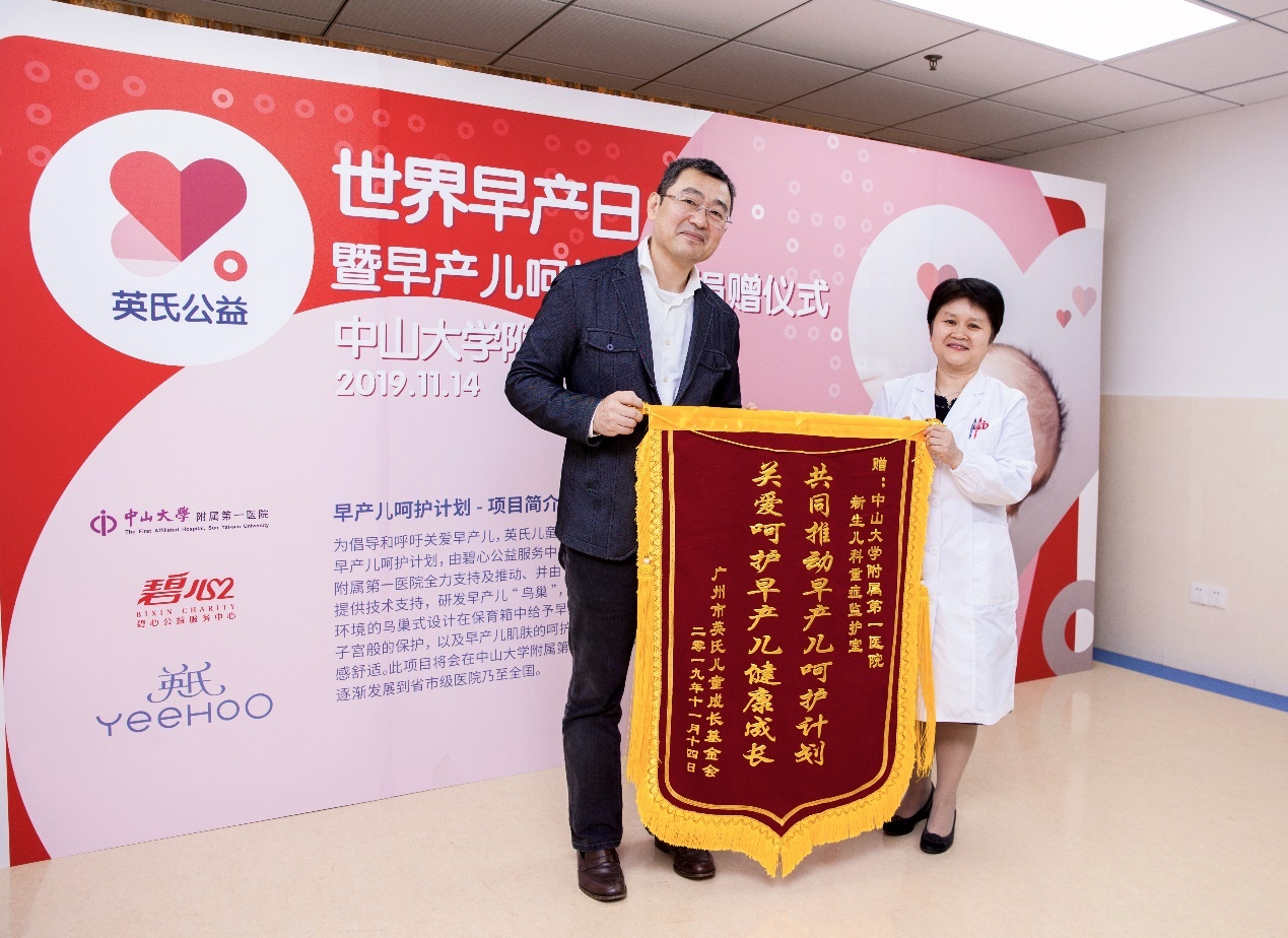 YeeHoO英氏首席执行官兼总裁、英氏儿童成长基金会理事栾熙忠先生向中山大学附属第一医院新生儿科重症监护室颁发锦旗致谢