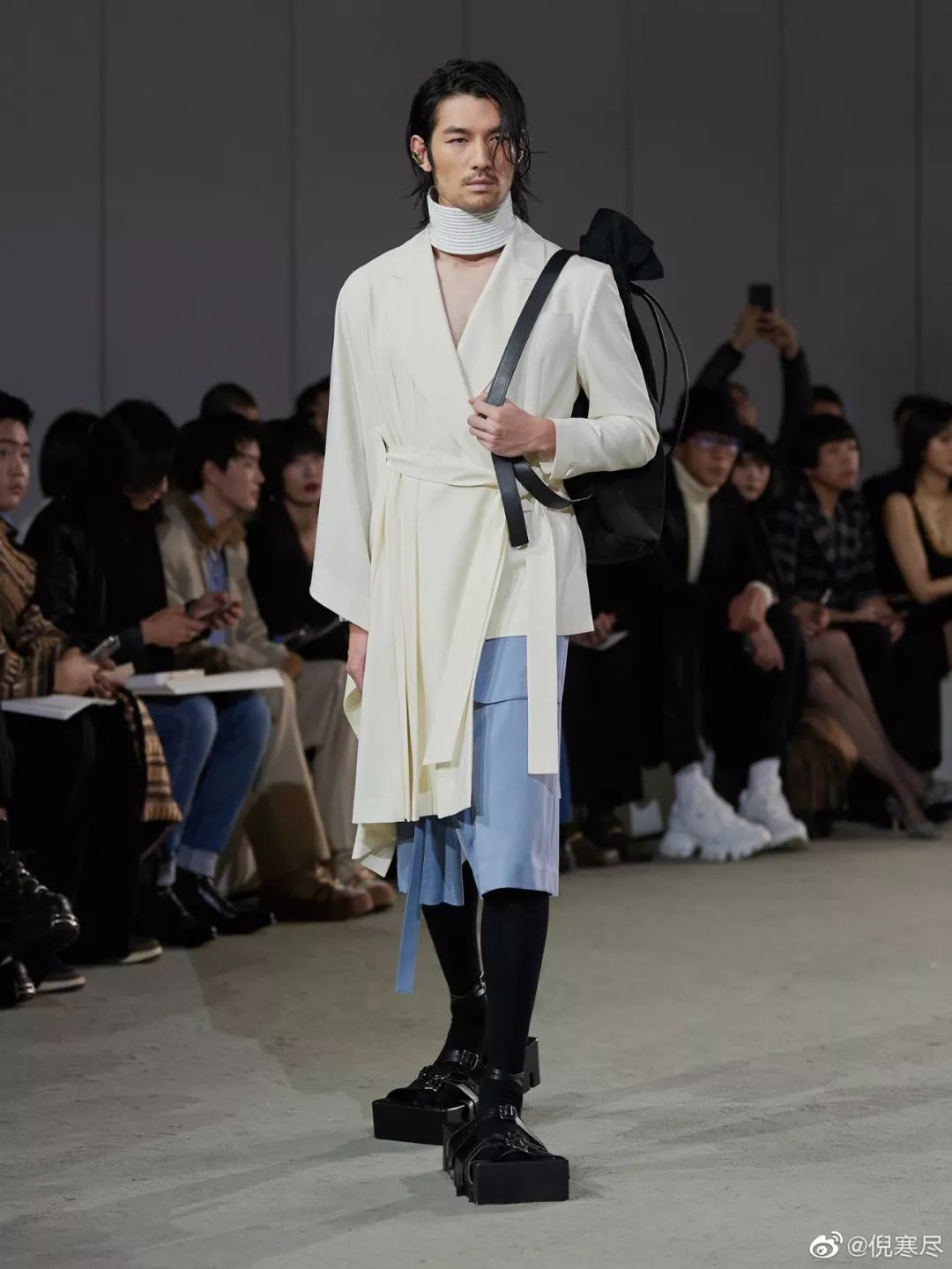 倪寒尽在今年MAISON SANS TITRE 2020春夏时装秀上,以演员的身份,跨界来时尚圈走秀。倪寒尽身材颀长,低调中展现出沉稳的潇洒与内敛的优雅,释放着不凡的时尚表现力,自由与洒脱,都在他的抬眸之间流转,令人印象深刻。