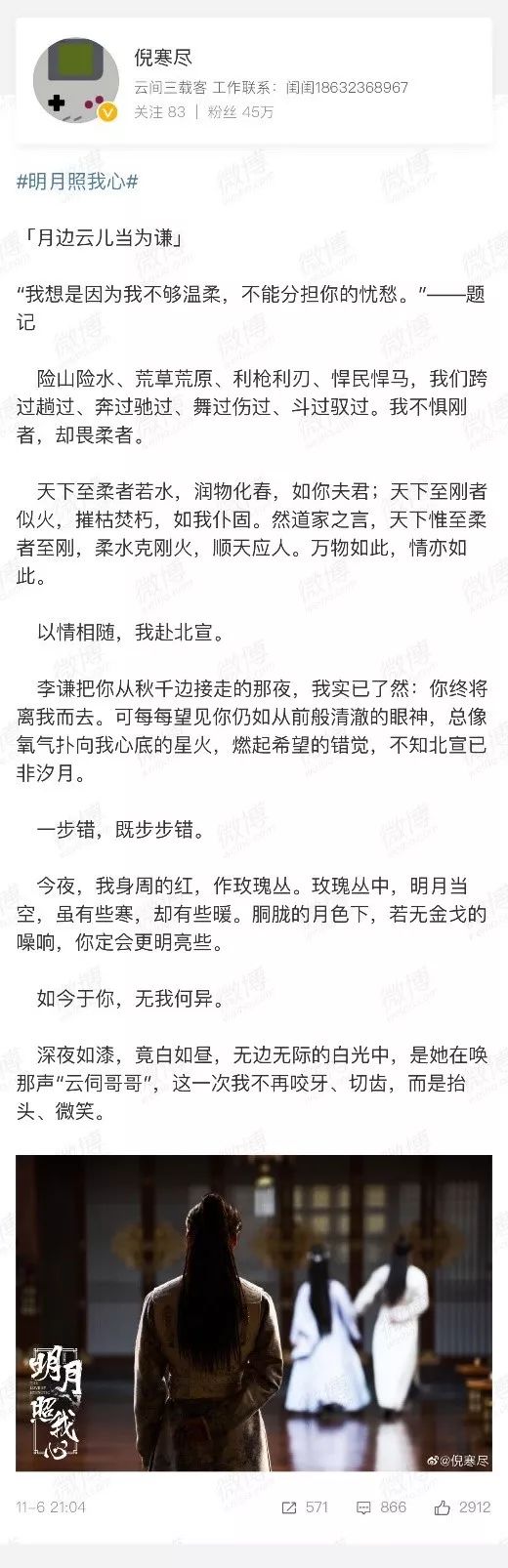 在《明日照我心》收官之际,倪寒尽写下了一段个人心得,字字句句流露出对角色的深思和真情。值得一提的是,许多网友对他半文言文半白话文的词句产生了不小兴趣,纷纷发表感叹:“看不出小哥文采这么好!”再深入围观一下倪寒尽的微博文案,简直就是在这个网感化语言世界中徜徉的一股清流,书生气息透屏生香。