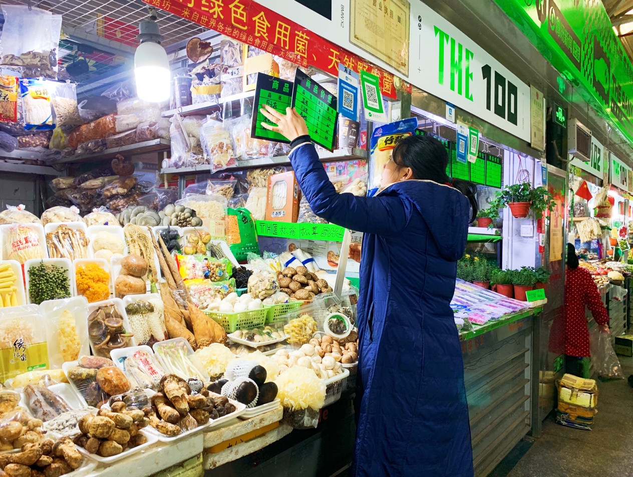对于58岁的董老板来说,这次改造让她觉得非常新鲜,之前三源里菜市场作为北京城菜市场里最有名的一家,也有不少品牌在这里举办过活动,但看起来没有这么“大胆”的。一夜之间,招牌、价签焕然一新,“不少客人会特意停下来看这些牌子上的设计,这个绿色比较显眼,引人注目,我还蛮喜欢的。”