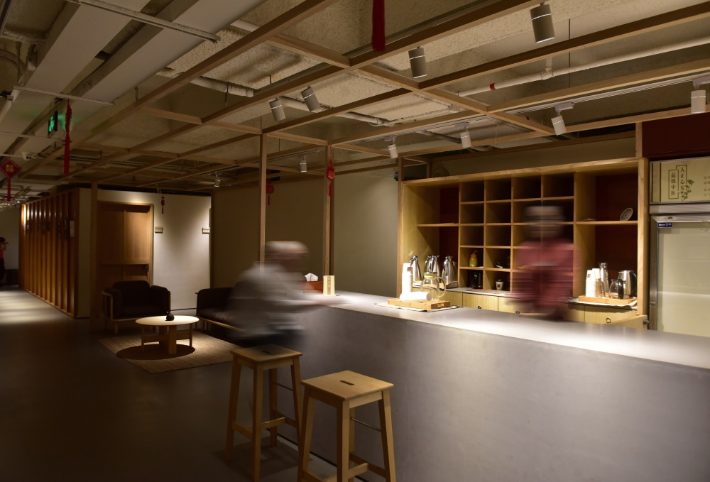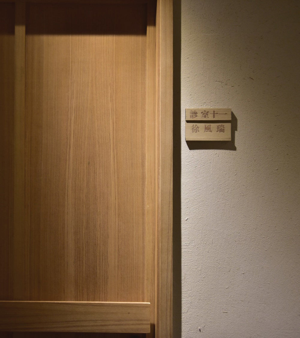 很难想象这样的医馆竟坐落于CBD的写字楼中。没有自然光线反而更不会被外界所打扰。古香古色的木质中药柜,是从老店直接沿用过来的,与前面的水磨石长调剂吧台形成鲜明的对比。这种新与旧的“混淆感”似乎在这个空间里随处可寻——上方裸露的工业化管道,与不乏传统印痕的家具陈设共成一体。这一切都映射出品牌理念所蕴含的东方智慧。