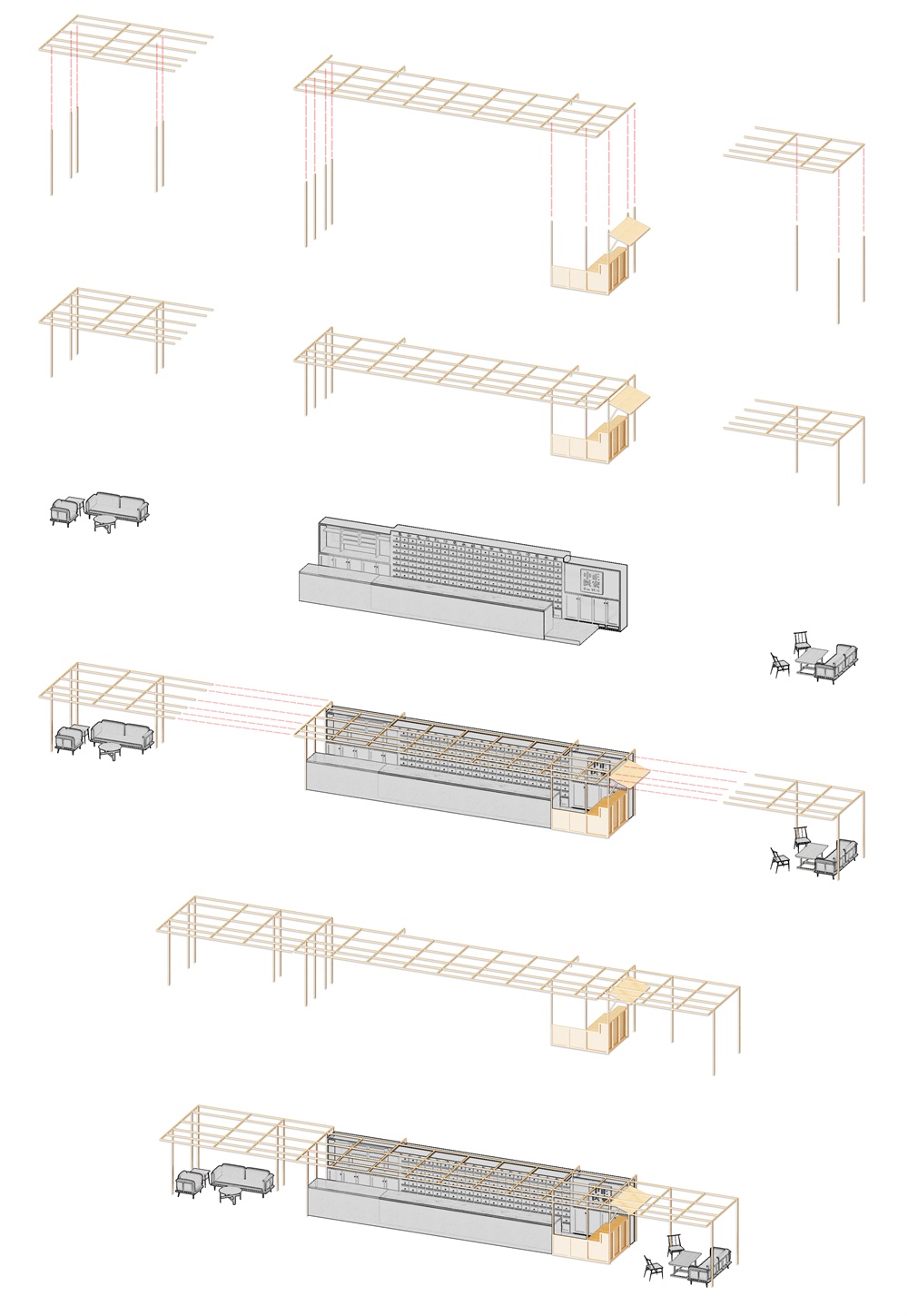 公共客厅的整个空间通透,不带有任何鲜明中式符号化的烙印,“无”形式、“无”修辞,显出开放与自由。设计师未赋予医馆任何“风格”,悉心选择材料、构件,令其中的一器一物成为主体。并通过木架的形式统筹起等候、调剂、收银、水吧及展示和宣传等功能区。此时自然质朴的实木条在设计师眼中有了新的定义,即是划分、围合空间的构件,也留给使用者未来宣传展示、装饰的一种可能性。