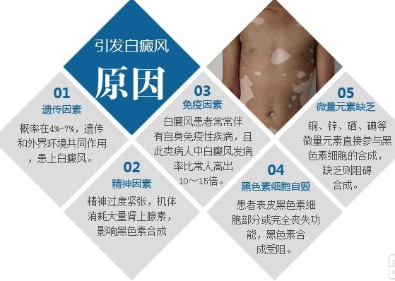 导致这一疾病出现的外在因素有很多,比如最常见的外伤,化学物质刺激等等,只有在环境因素和遗传因素共同作用下,才会出现白癜风遗传发病事件,所以,白癜风患者不必过分的担忧,可以结婚生子,但作为白癜风患者的子女,还是应谨慎,尽量养成好的生活习惯,做好白癜风的预防工作。