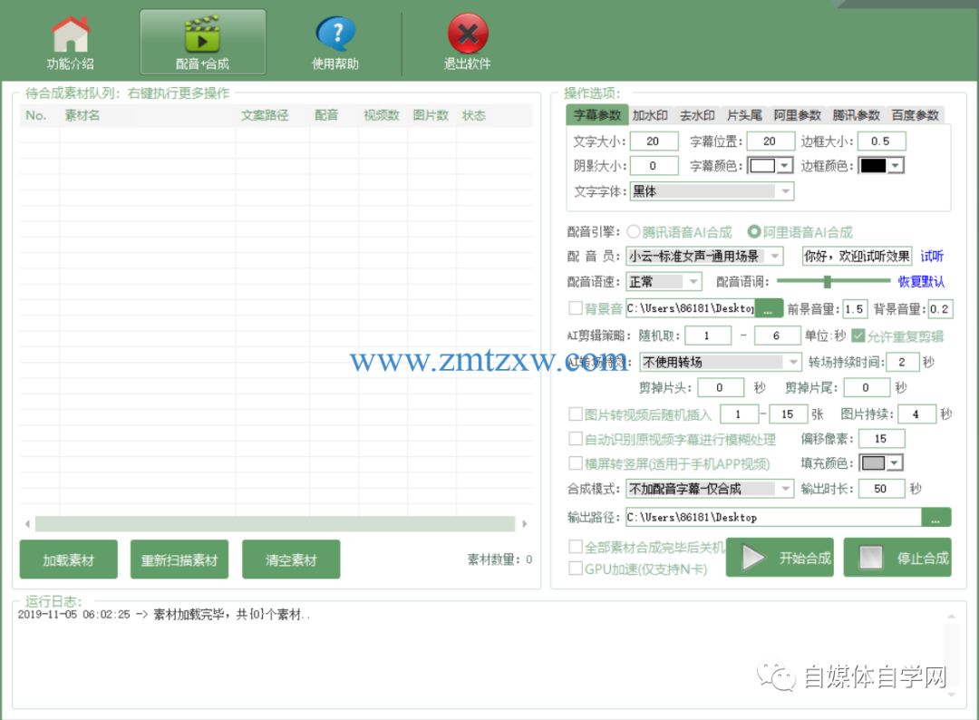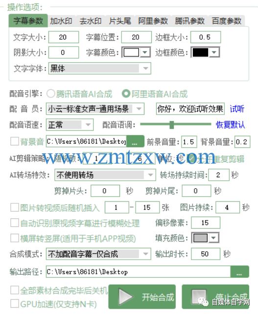 支持单个转换字幕、批量转换字幕;批量合成字幕、配音;手动精剪视频素材;去除原视频字幕(模糊处理);配音同时添加背景音乐;图片转视频进行合成;横屏竖屏转手机竖屏(适用于手机APP视频);导出配音、字幕;支持GPU加速;支持双引擎合成:腾讯AI语音合成、阿里AI语音合成;多合成模式:可合成视频、可单独生成配音、字幕;独家支持视频转场特效;