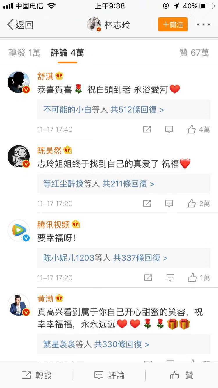 评论区大多人还是表示祝福,希望他们两人能够长长久久。除了粉丝之外,舒淇、黄渤也是第一时间送上祝福,希望他们白头到老,永浴爱河。还有很多大V博主、各大平台官微也陆续前来送上自己的祝福。