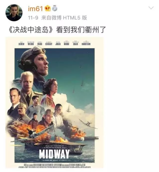 “我们大衢州也上了好莱坞大片!”今天,有人在朋友圈惊叹。而微博上也有同样呼应,有网友激动发文:“《决战中途岛》看到我们衢州了!”