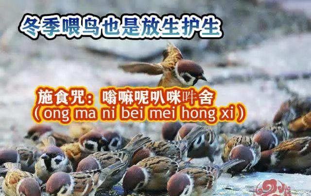 布施这些东西的时候念:“嗡嘛呢叭咪吽舍(ong ma ni bei mei hong xi)”。你念这个咒,饿鬼道能吃了。那么对于这个小鸟来说,能不能吃呀?能吃。第一,小鸟发现这些米,需要一个过程,不是你马上撒马上就吃了。它们需要观察,看此地是否安全。第二,它需要发现,因为之前它飞过的时候,这个地方没有什么吃的。也许再次飞过的时候,它就不会太注意。
