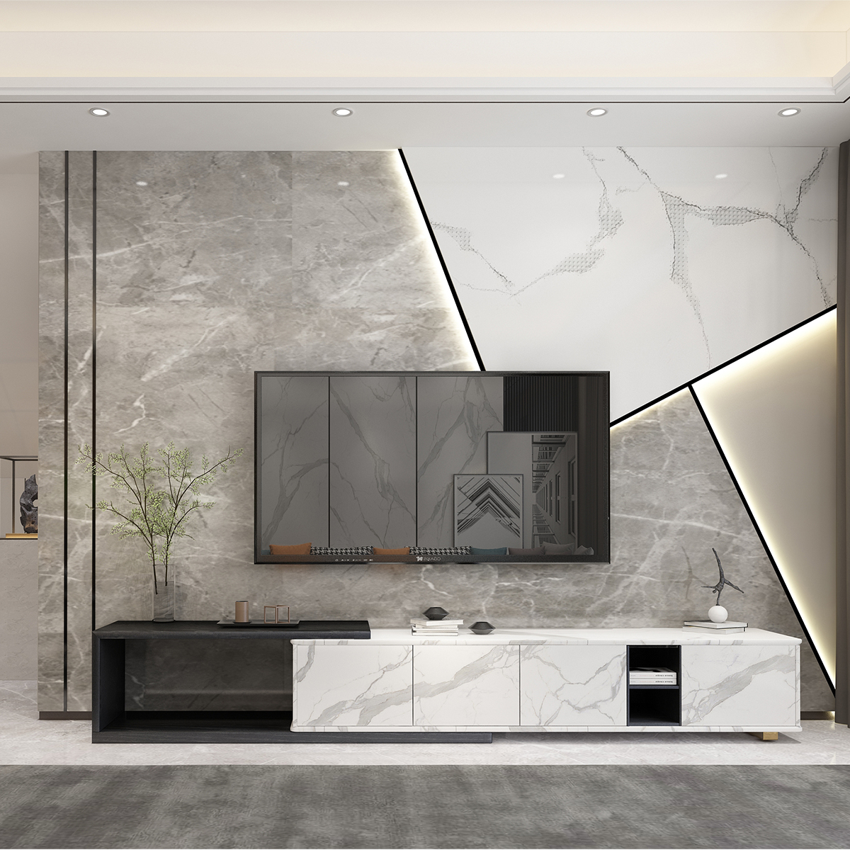 灰白的岩板电视背景墙,浅灰色的窗帘,搭配黑白色的茶几和灰色的沙发,既有现代风格的时尚美感,更多的却是简约风格的文艺气息,一抹绿色的点缀,让人眼前一亮。