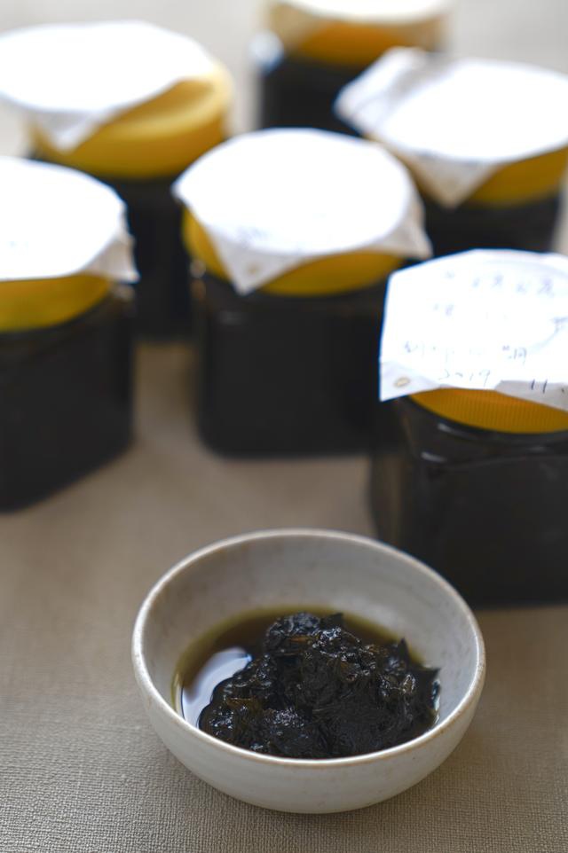 4、用两年以上的咸菜尾(腌芥菜)切丝放入炒至黑色的橄揽中,放上大量的玉米油,再不停翻炒约3个小时。经过前后九个小时的精心慢火炒焖,即成橄榄菜。