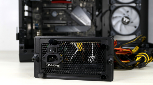 透过电源尾部的网格,可以看到电源内部的用料。简单看一看,一、二级的EMI电路非常完整。一级EMI电路靠近电源的输入口,直接做到了电源输入口后面的PCB上,二级EMI电路非常完整,可以看到两个共模滤波扼流电感,黑色的两个铜圈就是,共模滤波电容也能看到。左侧可以看到一个硕大的整流桥,上面压着一个硕大的铝制被动散热,并有预设有输入接口和开关。