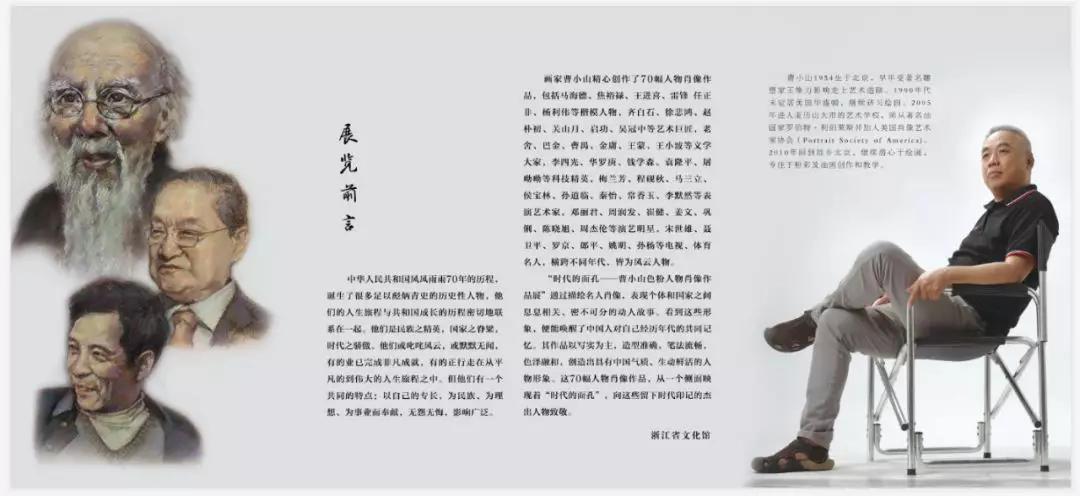 本次展览展出画家曹小山精心创作的70幅人物肖像作品,包括马海德、焦裕禄、王进喜、雷锋、任正非、杨利伟等楷模人物,齐白石、徐悲鸿、赵朴初、关山月、启功、吴冠中等艺术巨匠,老舍、巴金、曹禺、金庸、王蒙、王小波等文学大家,李四光、华罗庚、钱学森、袁隆平、屠呦呦等科技精英,梅兰芳、程砚秋、马三立、侯宝林、孙道临、秦怡、常香玉、李默然等表演艺术家,邓丽君、周润发、崔健、姜文、巩俐、陈晓旭、周杰伦等演艺明星,宋世雄、聂卫平、罗京、郎平、姚明、孙杨等电视、体育名人,横跨不同年代,皆为风云人物。他们或叱咤风云,或默默无闻,有的业已完成非凡成就,有的正行走在从平凡到伟大的人生旅程之中。但他们有一个共同的特点:以自己的专长,为民族、为理想、为事业而奉献,无怨无悔,影响广泛。