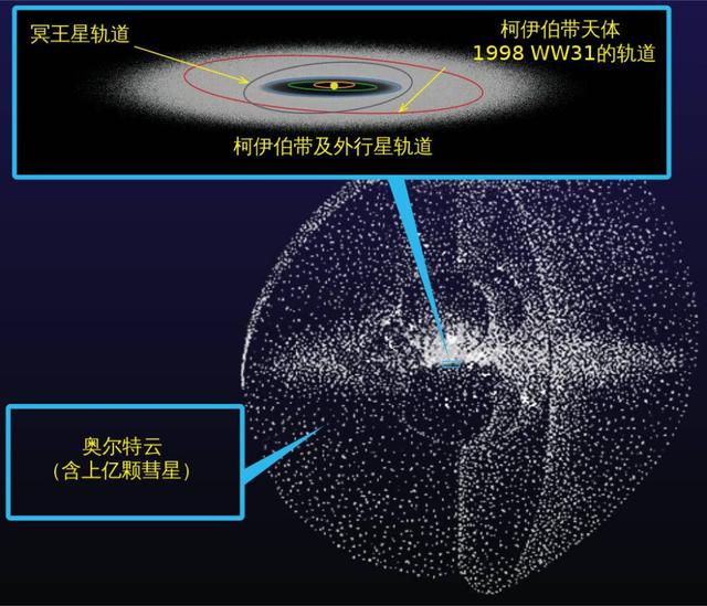 太阳冥王星的平均距离约为39.5AU。估计频带从柯伊伯 47.7Au 39.4金延伸。离散的圆盘与柯伊伯波段重叠,但向外延伸,被认为是短期彗星的发源地。