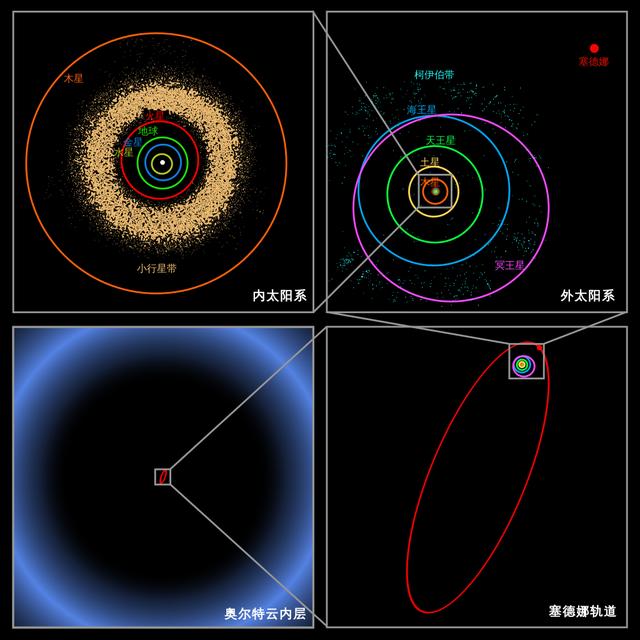 塞德纳(Sedna)的轨道特别长,大约11400年,短距离为76 AU。