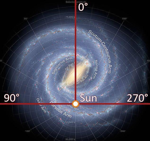 接下来还指示太阳在银河系中的位置。这些角坐标代表经度星系。