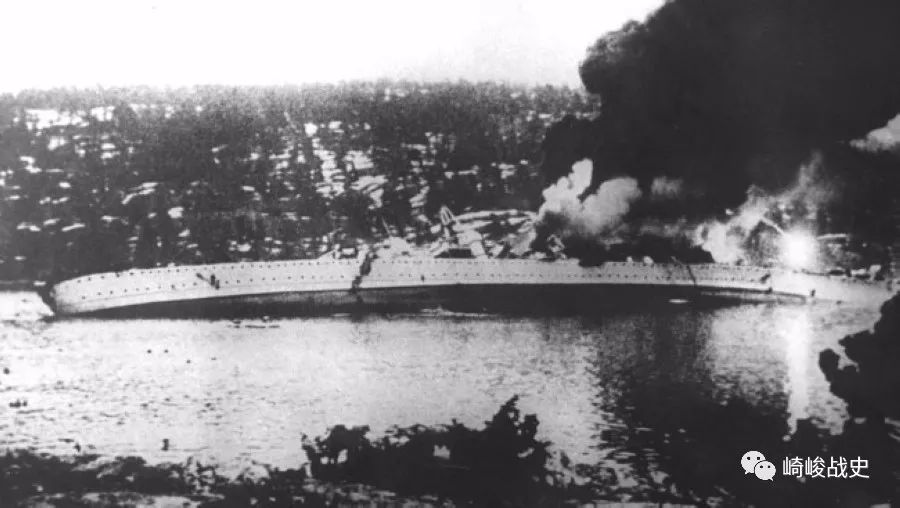 ■ 1940年4月9日晨遭岸炮轰击、行将倾覆的“布吕歇尔”号重巡洋舰。