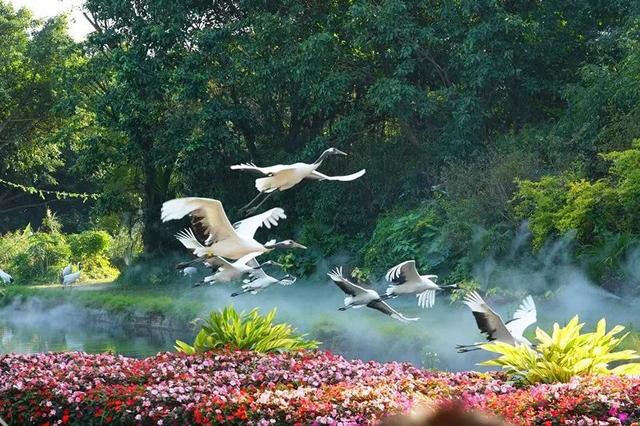 一定不要错过的演出是“白鸟飞歌”,是火烈鸟、天鹅、仙鹤百鸟齐飞的大场面,现场观看特别棒。