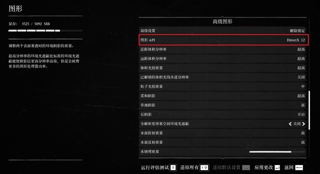《荒野大镖客2》中还有如图中一处细致化设置,如图显示,解除锁定后,图形API中有Vulkan与DirectX12两种选项,由于本次选用的是N卡,所以游戏测试需要改变默认设置,改为“DirectX12”。