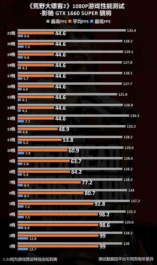 影驰GTX1660SUPER运行《荒野大镖客2》比较稳定,每一档设置的最高与最低FPS数据不会出现忽高忽低的情况。1-10档平均FPS达到60以上,甚至接近100,游玩体验是非常不错的;11-21档平均FPS处于60以下,但整体游戏运行比较稳定,总的来说,影驰GTX 1660SUPER支持《荒野大镖客2》在1080P画质下的游戏畅玩体验,甜品级显卡,果然物有所值。