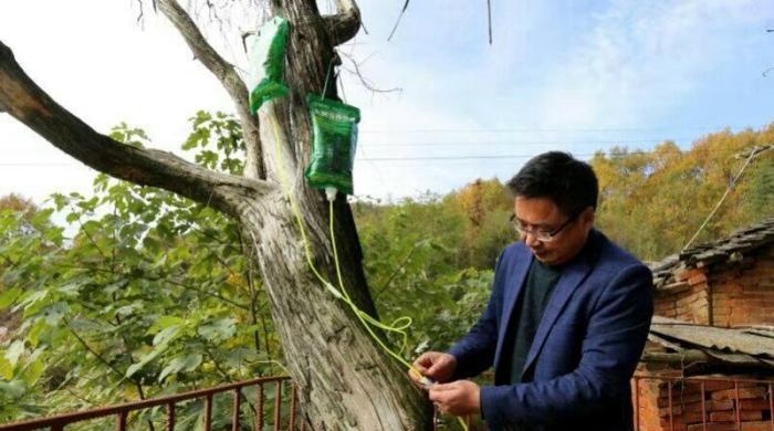 当日,专家们现场指导,开展根部复壮,对树根杀菌消毒、施肥,培育根系;为该树输营养液,补充养分。同时制定方案,拟于明年春季进行“补根手术”,用新培育出的垂枝侧柏靠近粘贴助老树生长(相当于器官移植)。
