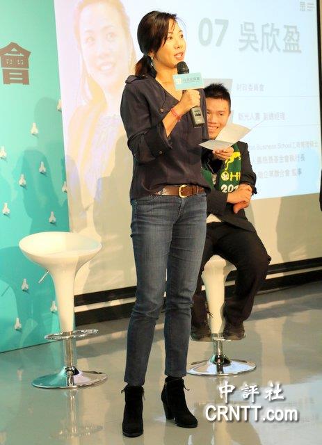 吴欣盈穿着时尚出席民众党记者会。(中评社 郑羿菲摄)