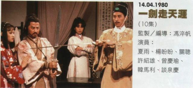 1980年4月,古装武侠剧《一剑走天涯》播出,监制冯淬帆(就是后来在《五福星》系列电影里饰演犀牛皮的那个,很搞笑),主演有夏雨、杨盼盼、关聪、许绍雄、曾庆瑜、韩马利。