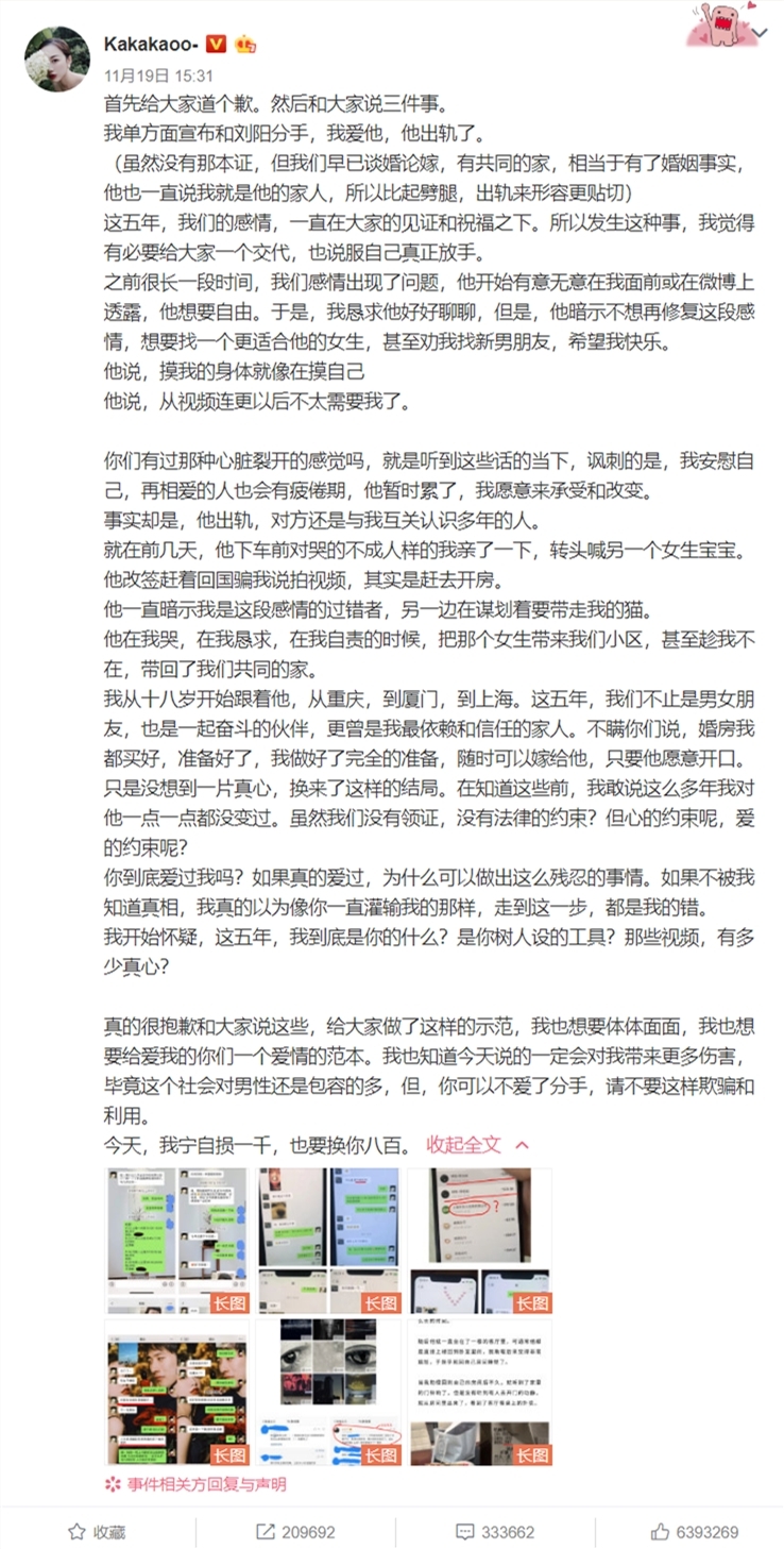 19日,网红阿沁在微博自爆,单方面和相恋5年的男友刘阳分手,原因是刘阳出轨阿沁互关多年并且认识的人——半藏森林,同时还晒出了多张出轨证据图。