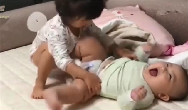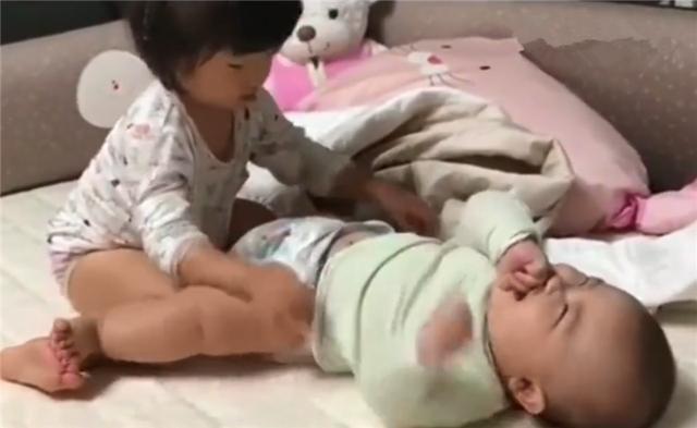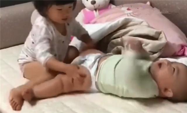 一天早上,妈妈在厨房做饭。当小宝醒来之后就开始大哭,原来是一整个晚上宝贝都没有换尿不湿,肯定是不舒服了,于是娟娟让她3岁的女儿拿出尿不湿。娟娟想着等自己收拾完就给宝宝换尿不湿,没想到小宝停止了哭泣,在厨房的妈妈还听到姐姐传来的大笑声,于是妈妈赶紧出来看看怎么回事。