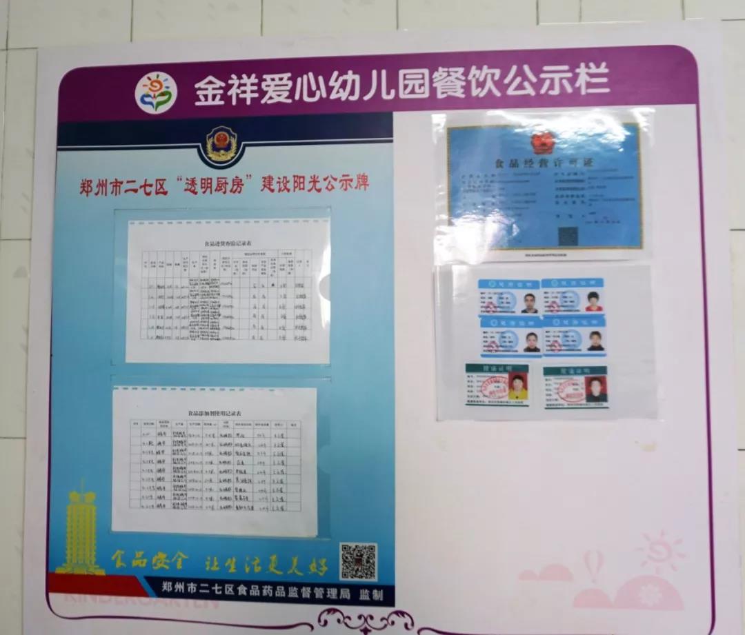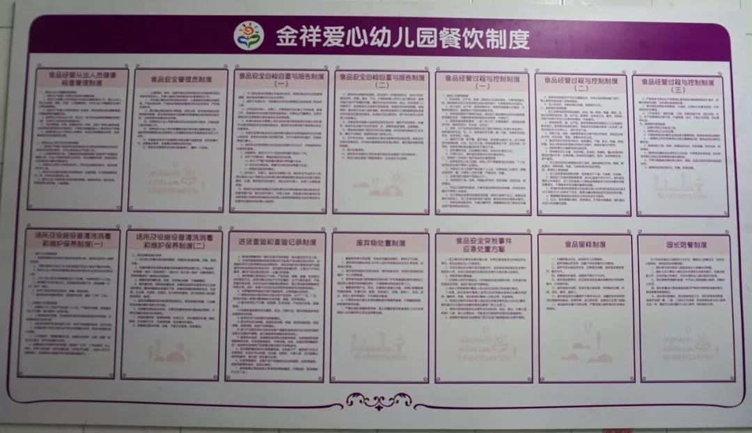 墙壁上贴着食药局要求的操作步骤和园里面的餐饮制度,后厨的师傅们都有健康证。