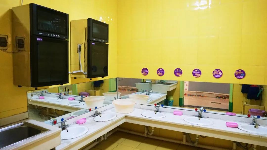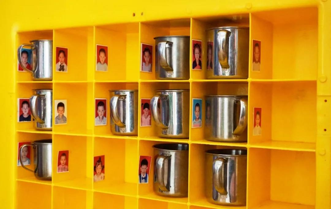孩子们的餐具都会放在洗手池上面的消毒柜里,吃饭前老师拿出来,帮助孩子们打饭,吃完饭洗干净之后再放回去消毒。