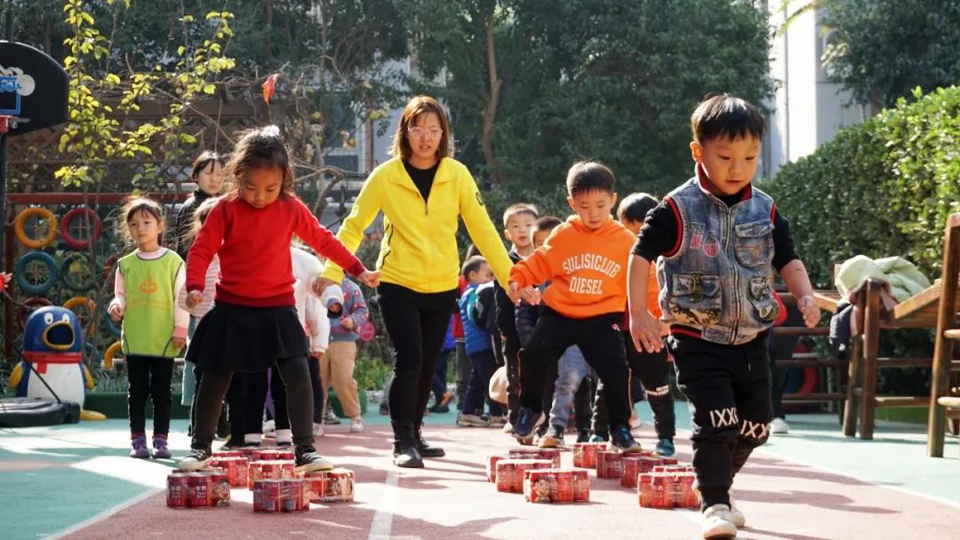 老师们会和家长互动,让家长和孩子们一起完成一些“游戏道具”的制作,孩子们脚下踩的就是家长们的杰作。
