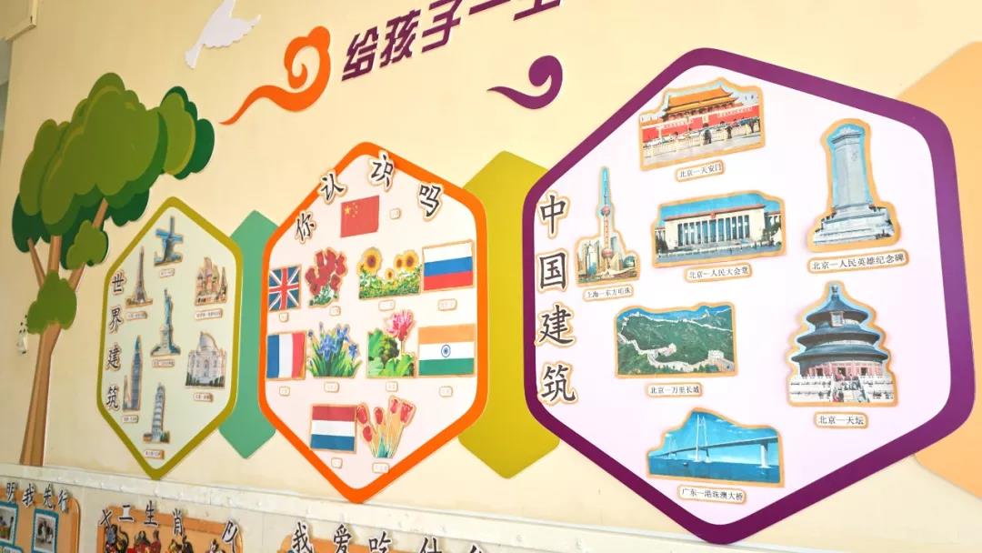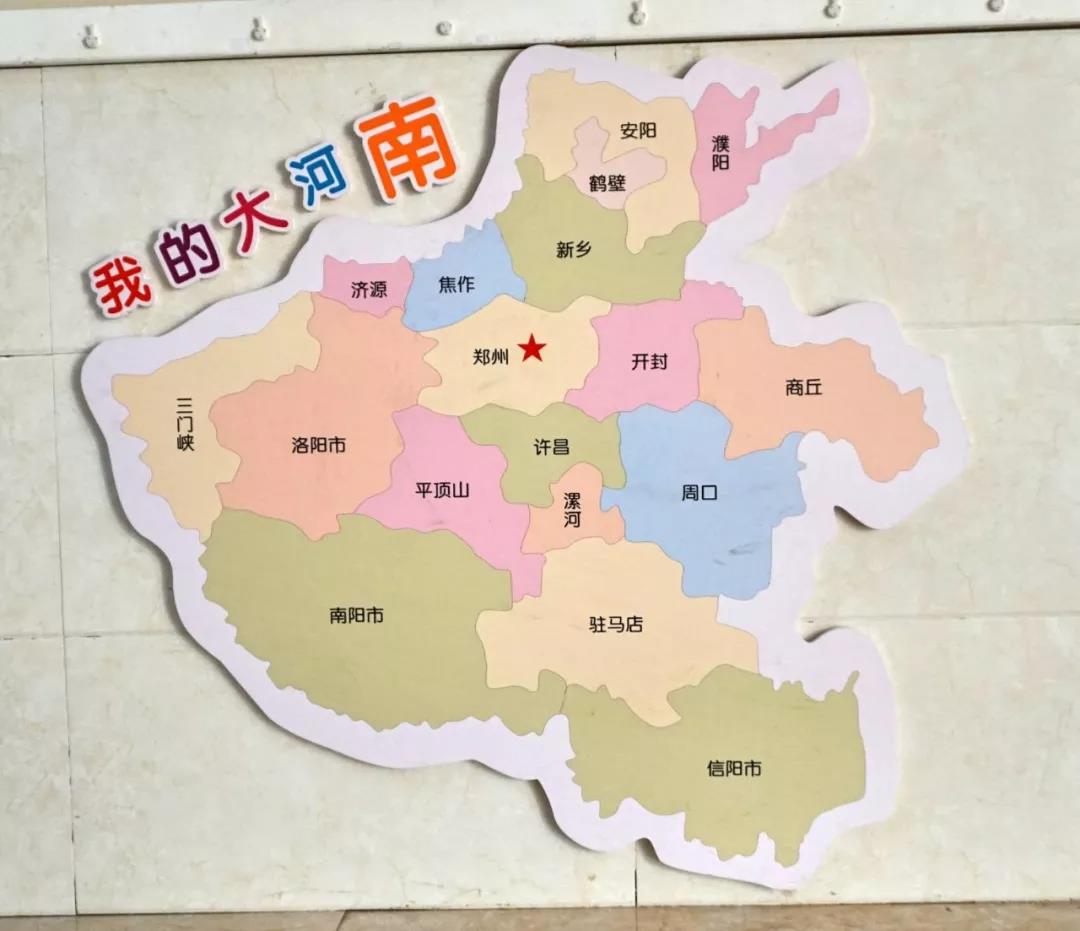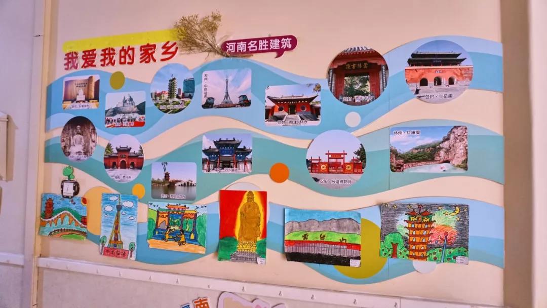 教学楼走廊的布置很有意思,比如,教孩子认识河南,还有和孩子们一起的画作,还有中国传统的文化符号,各地方的民俗。