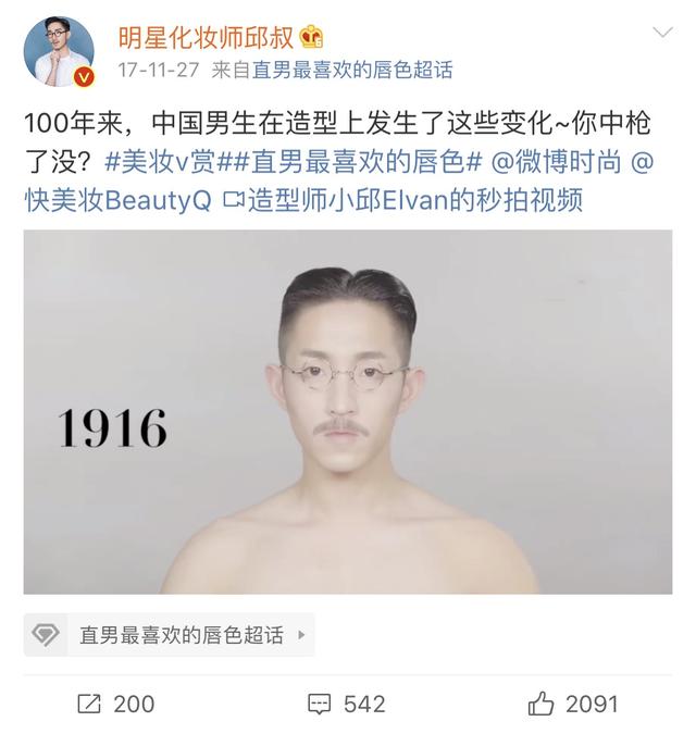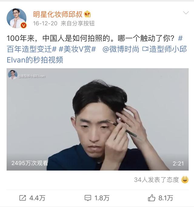 可能听名字你还想不起他是谁,但你一定看过他的“百年系列”化妆视频,“一百年来中国人是如何拍照的”以及“中国男性百年发型史”,都曾喜提过微博热搜。