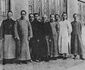 1928,燕京大学国文系,由左至右为沈士远、马蒙、许地山、冯友兰、吴雷川、周作人、容庚、郭绍虞、黄泽通。