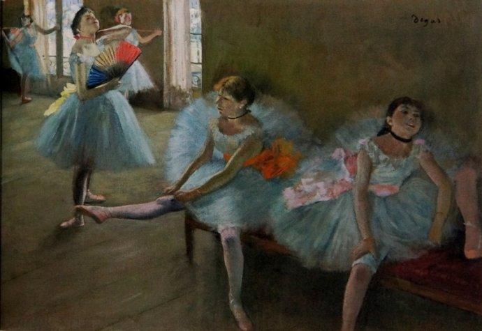 这幅画德加抓住了芭蕾舞者优雅的柔韧姿态, 以及她们在练功房内的竞争气氛下精疲力竭的心理感受,舞者疲惫不堪,各自沉浸在自己的世界中,无视彼此和观众。