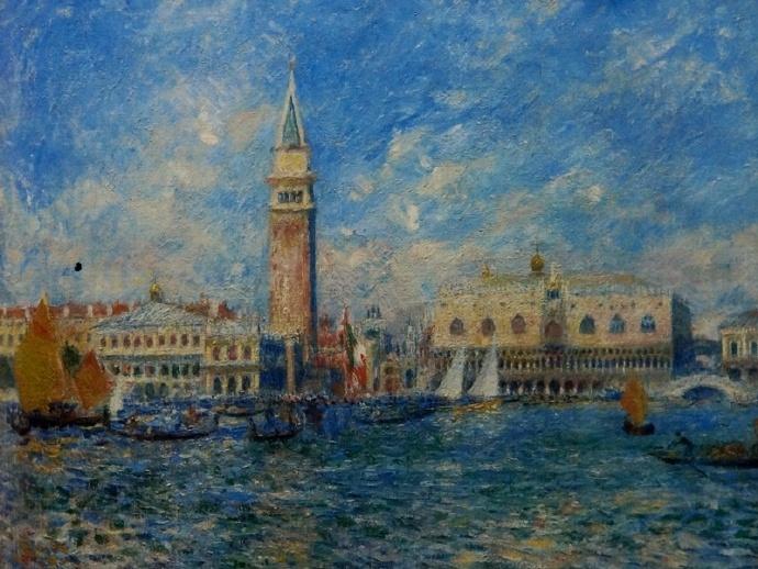 这件作品尽管采用了印象派特有的斑斓色彩并力图捕捉瞬间变幻的光线效果,但雷诺阿对建筑细节也刻画得十分精准,包括总督府的34个穹顶。阳光下奶油色的建筑立面局部映射出天空的蓝色,轮廓简略的贡多拉船和明亮的船帆点缀着前景,为画面的明亮色调增添了生动、多彩的一笔。