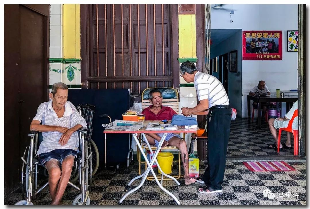 槟榔屿老城区沓田仔街152号,是一栋带院子的二层西式小洋楼。走近看,门头挂着“丽泽社”三个汉字,一楼门厅的墙上写着“天恩安老人院”。拄着拐杖的老太太颤颤巍巍,坐着轮椅的老头目光呆滞。一位中年服务人员走出来,轻声细语。