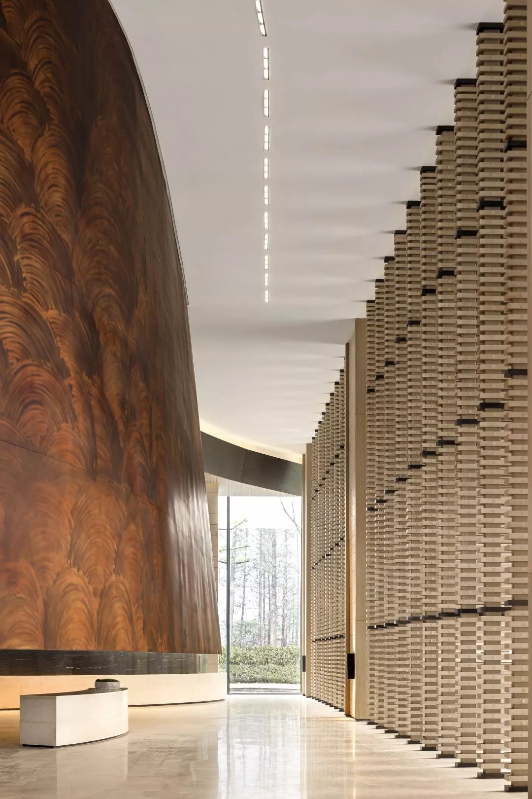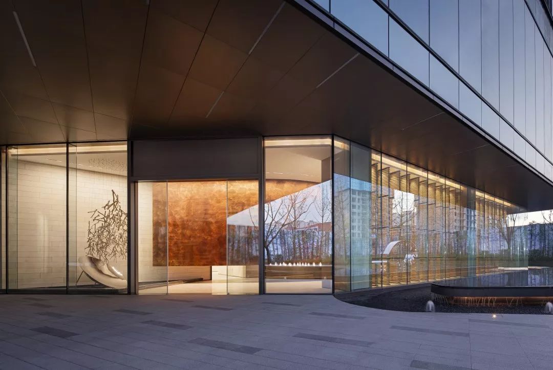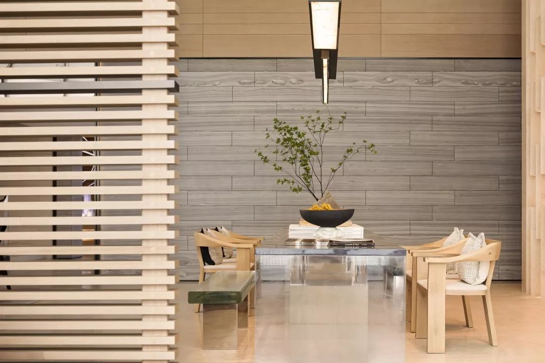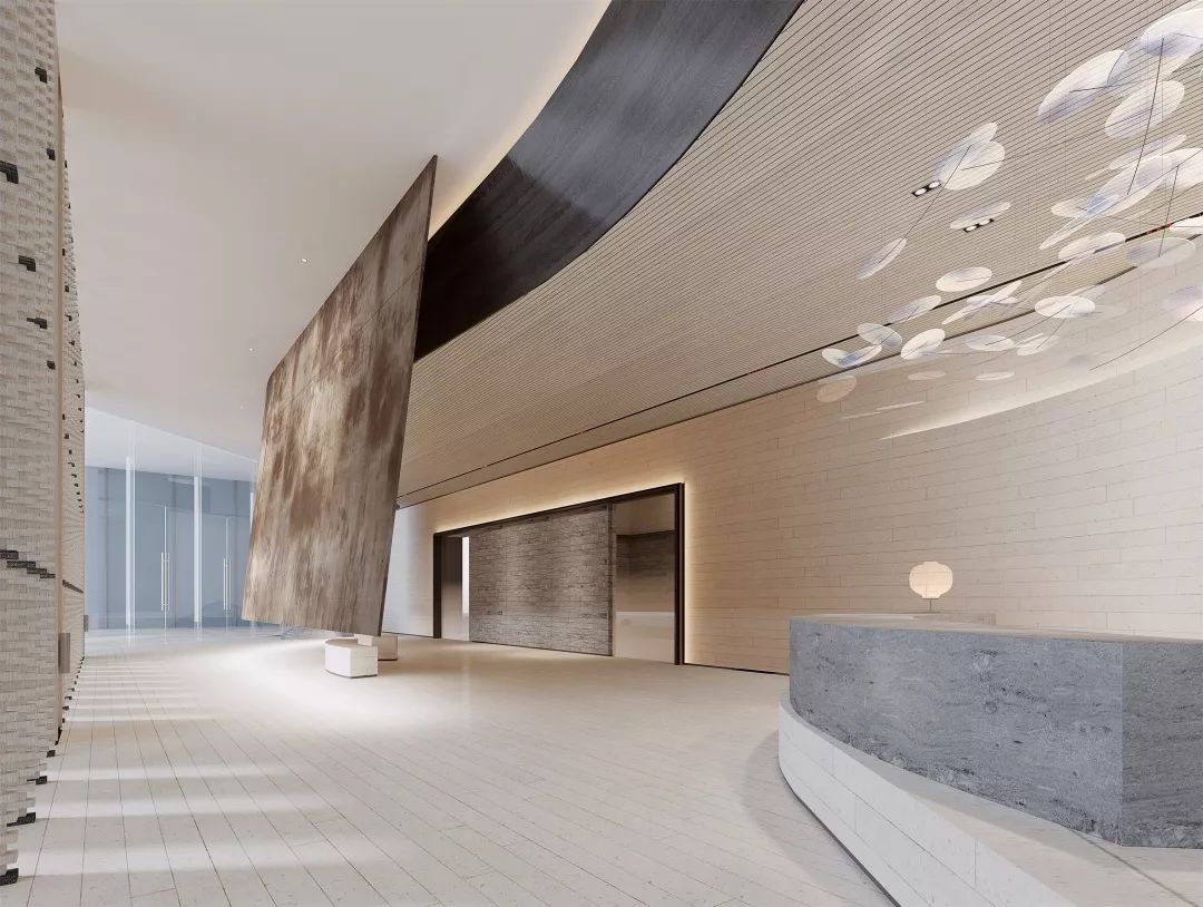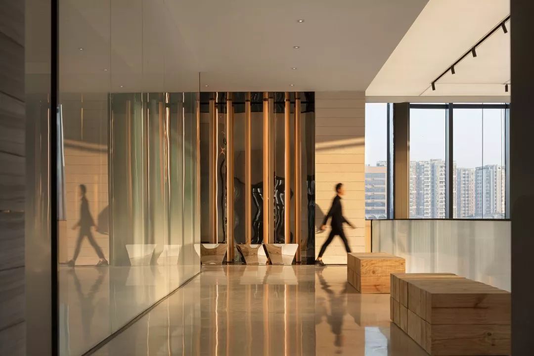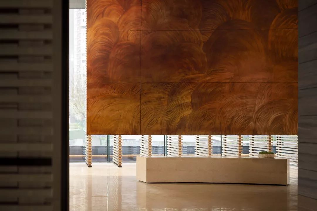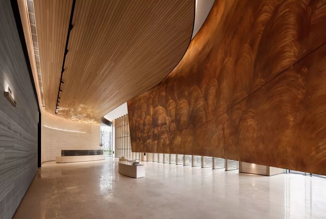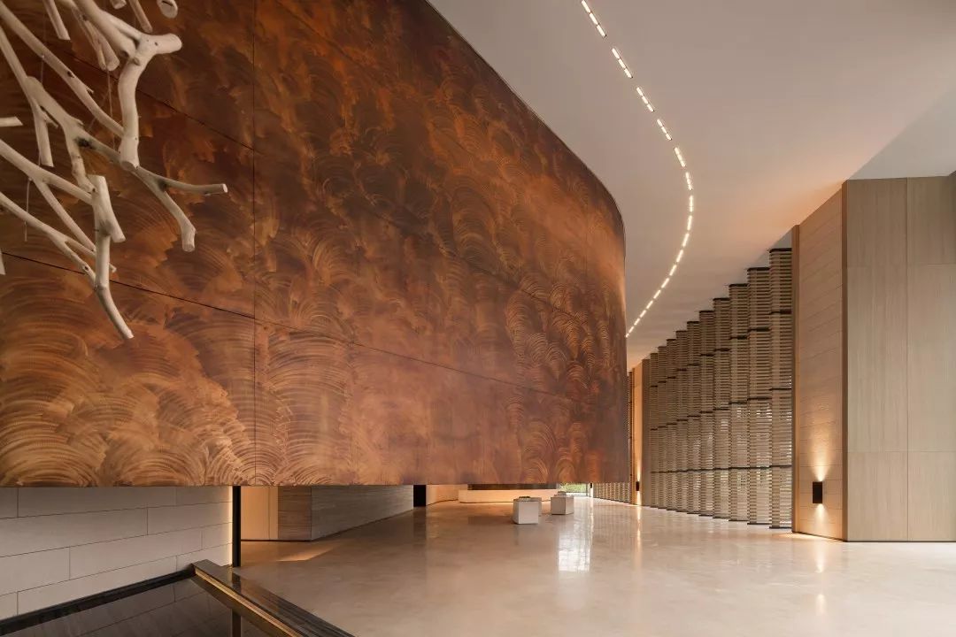 铜板材质的表面是光滑温润的,有轻微的反光。空间会显得更加具有分量感。玻璃幕墙一侧,是由木筏元素转化提炼的屏风造型,透光不同时间的光影变化,丰富生动。接待台上方吊挂的艺术装置,其主题为叶之荫蔽,叶子为万物洒下荫蔽,护佑的本质,都是因为对于这片生长地的热爱。灯光透过漂浮的圆片,会在地上投射出变化丰富的光影与颜色。空间稳重中带着灵动与飘逸,两者相得益彰。