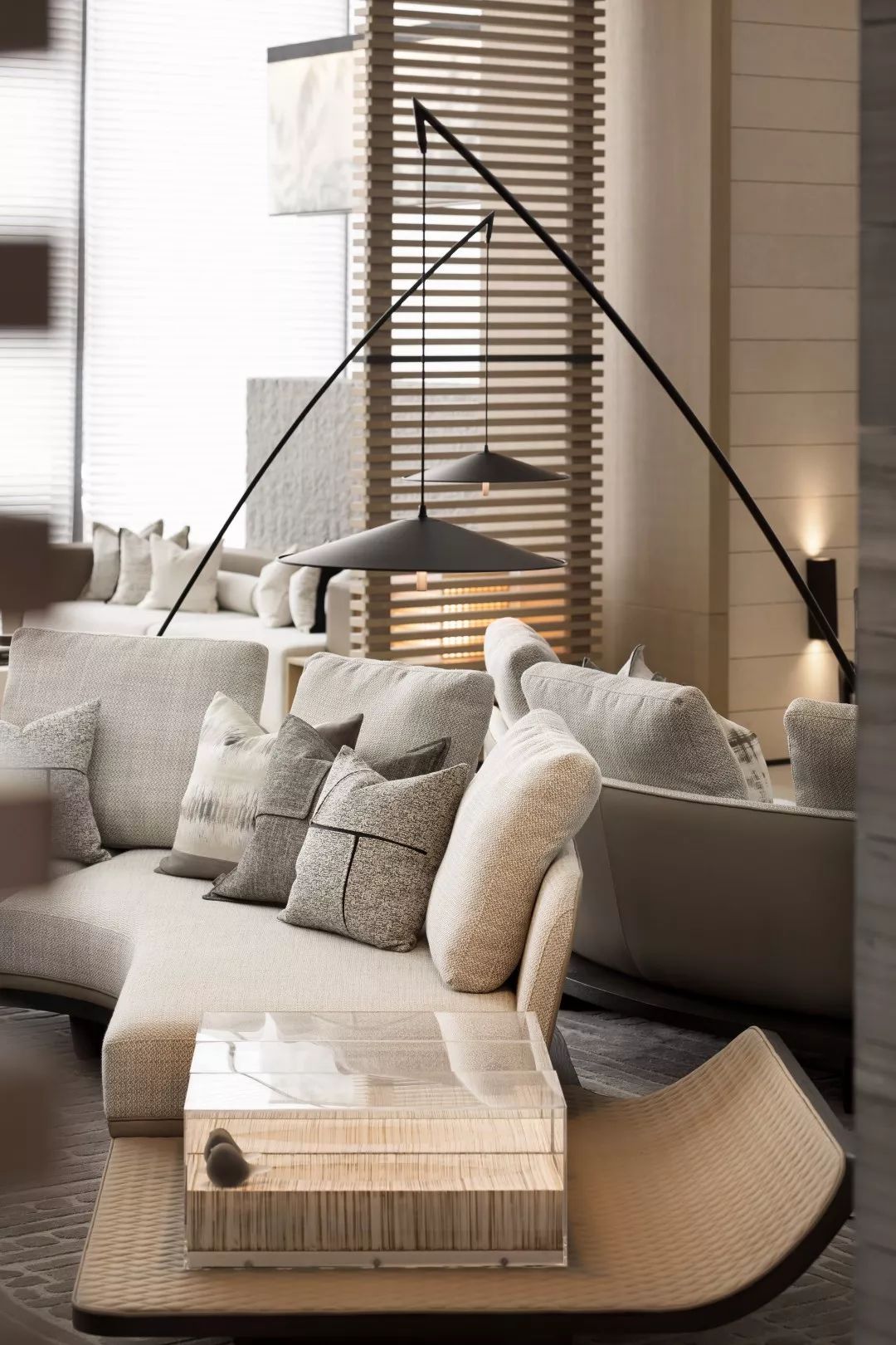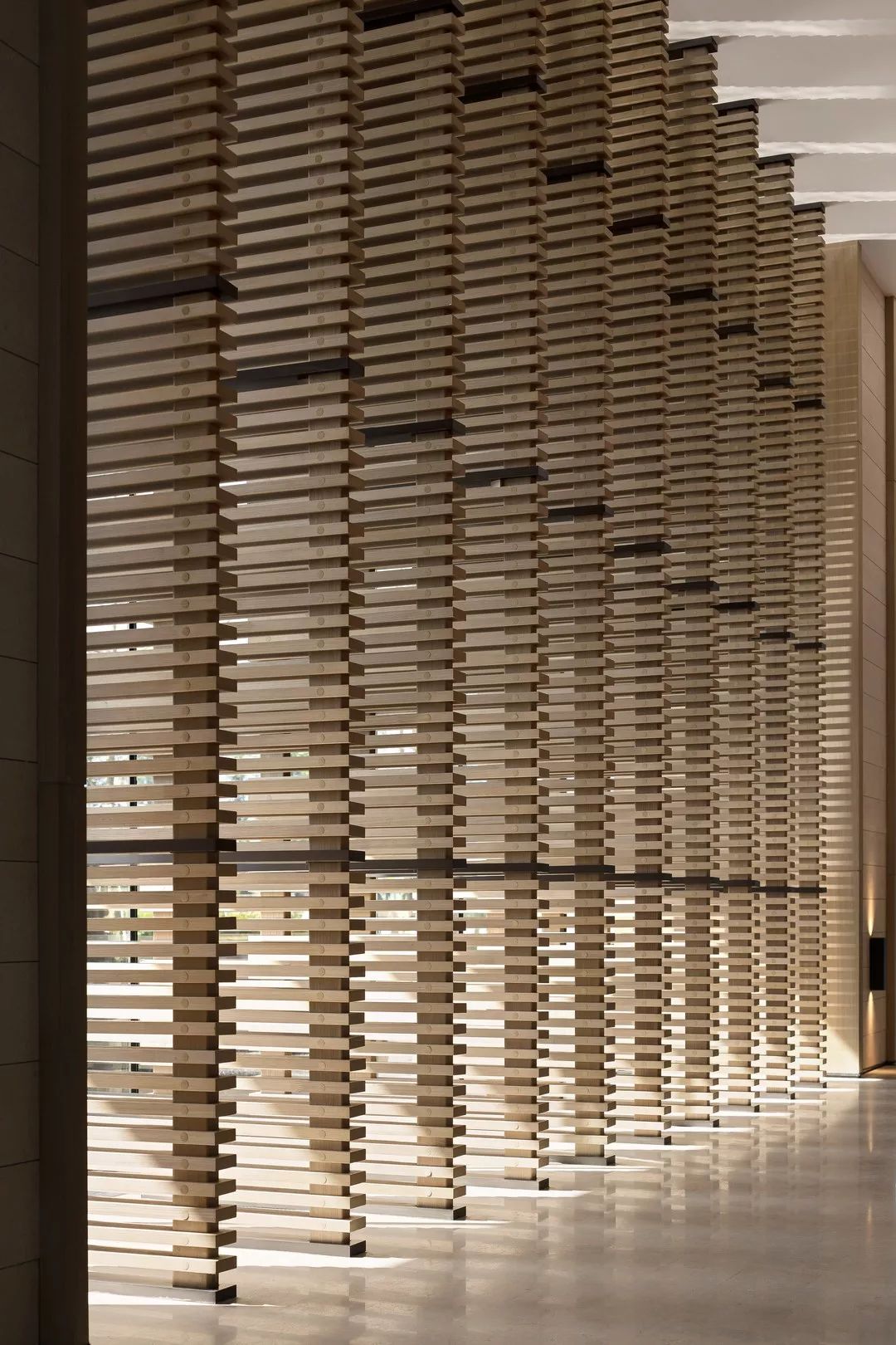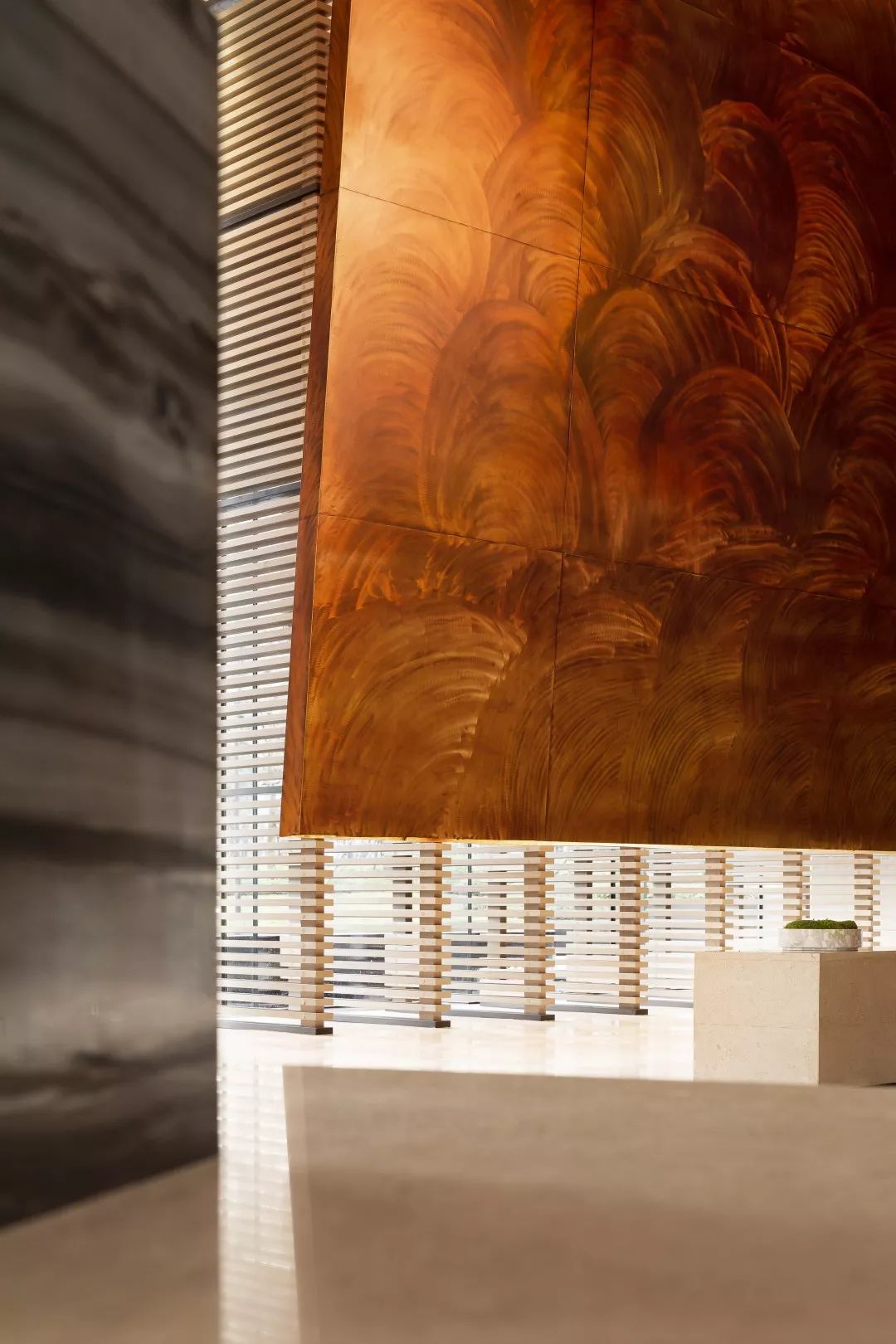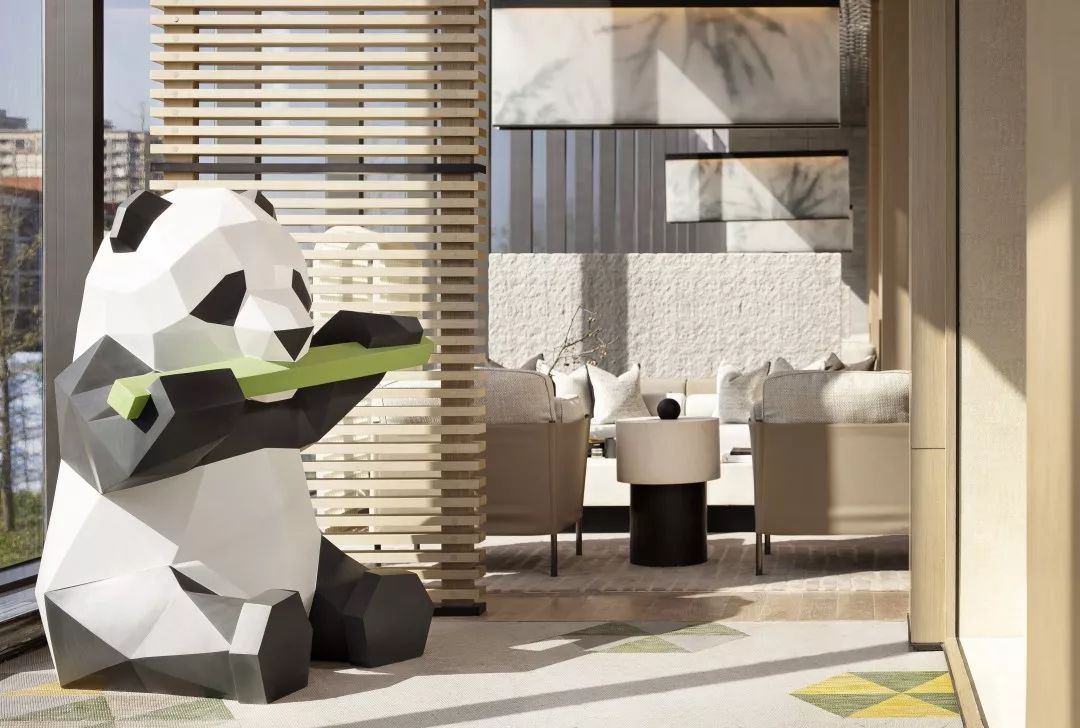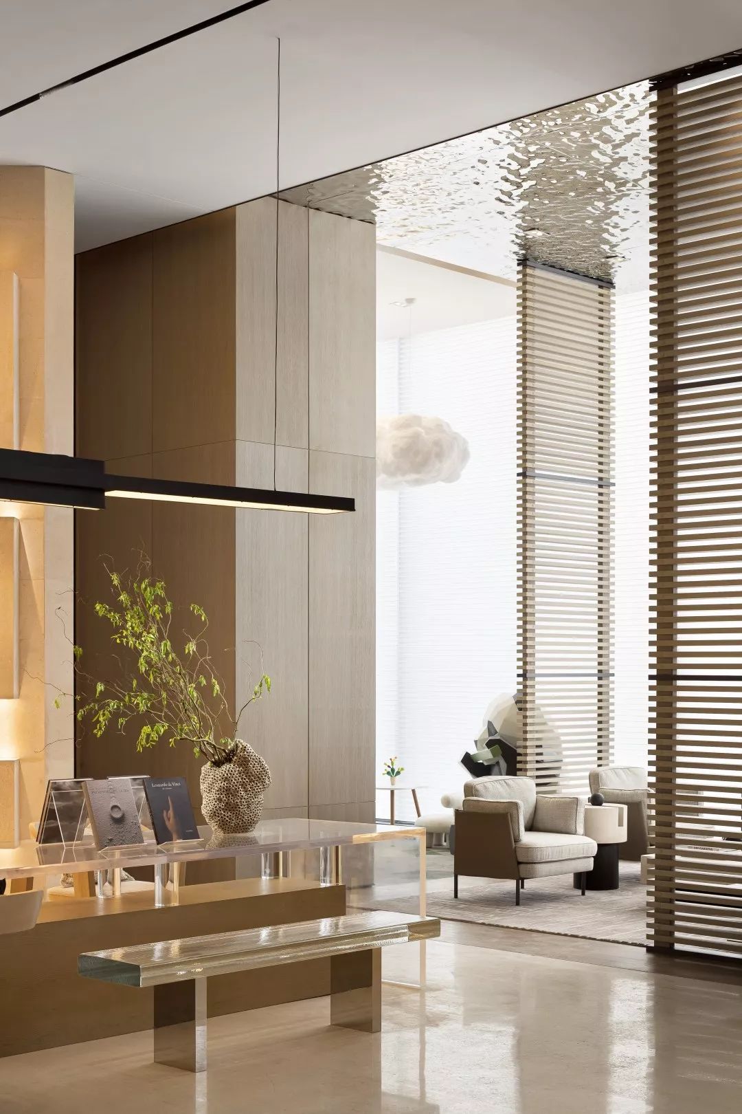 铜板材质的表面是光滑温润的,有轻微的反光。空间会显得更加具有分量感。玻璃幕墙一侧,是由木筏元素转化提炼的屏风造型,透光不同时间的光影变化,丰富生动。接待台上方吊挂的艺术装置,其主题为叶之荫蔽,叶子为万物洒下荫蔽,护佑的本质,都是因为对于这片生长地的热爱。灯光透过漂浮的圆片,会在地上投射出变化丰富的光影与颜色。空间稳重中带着灵动与飘逸,两者相得益彰。