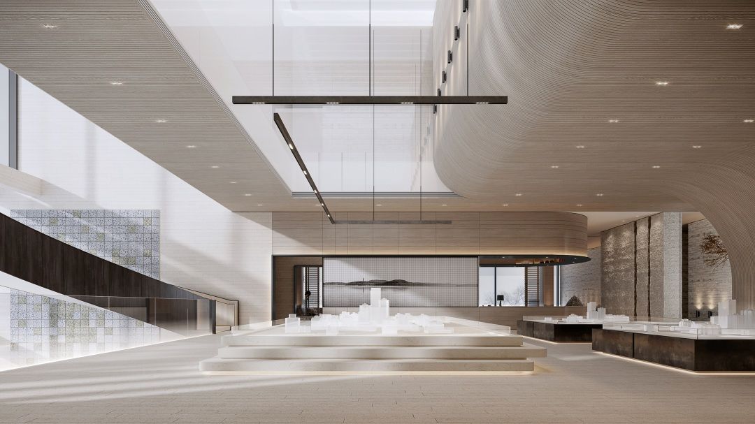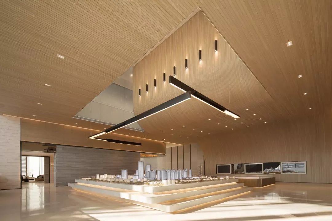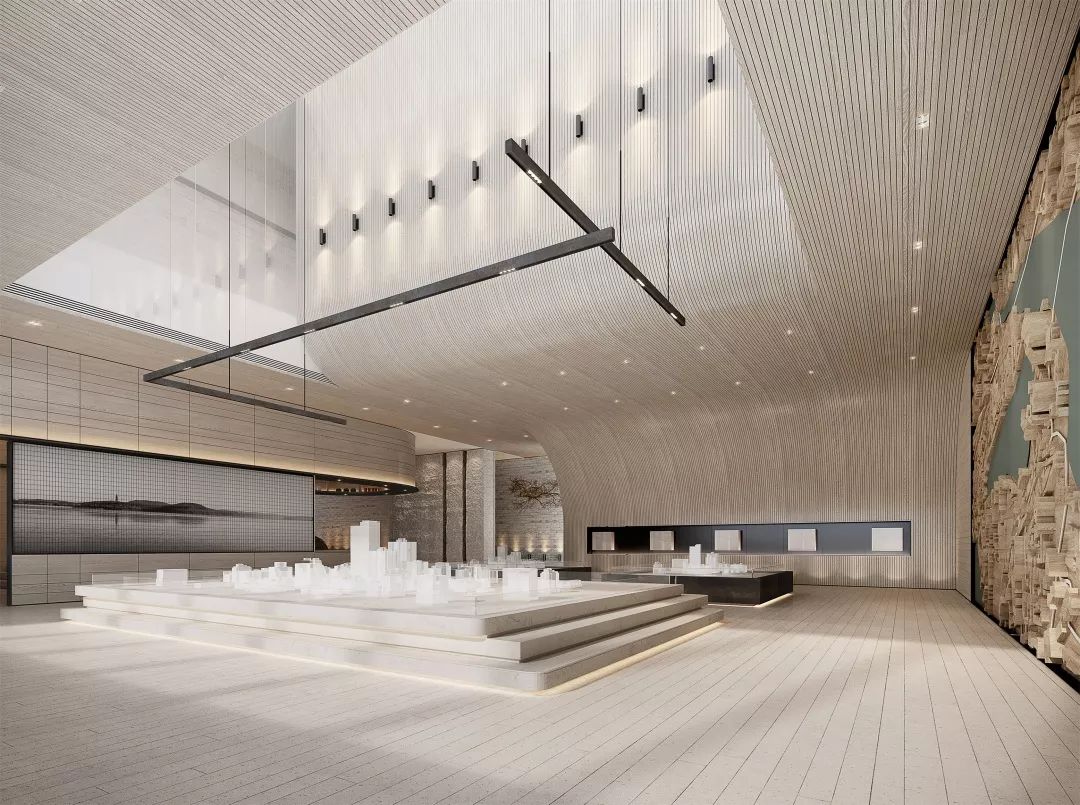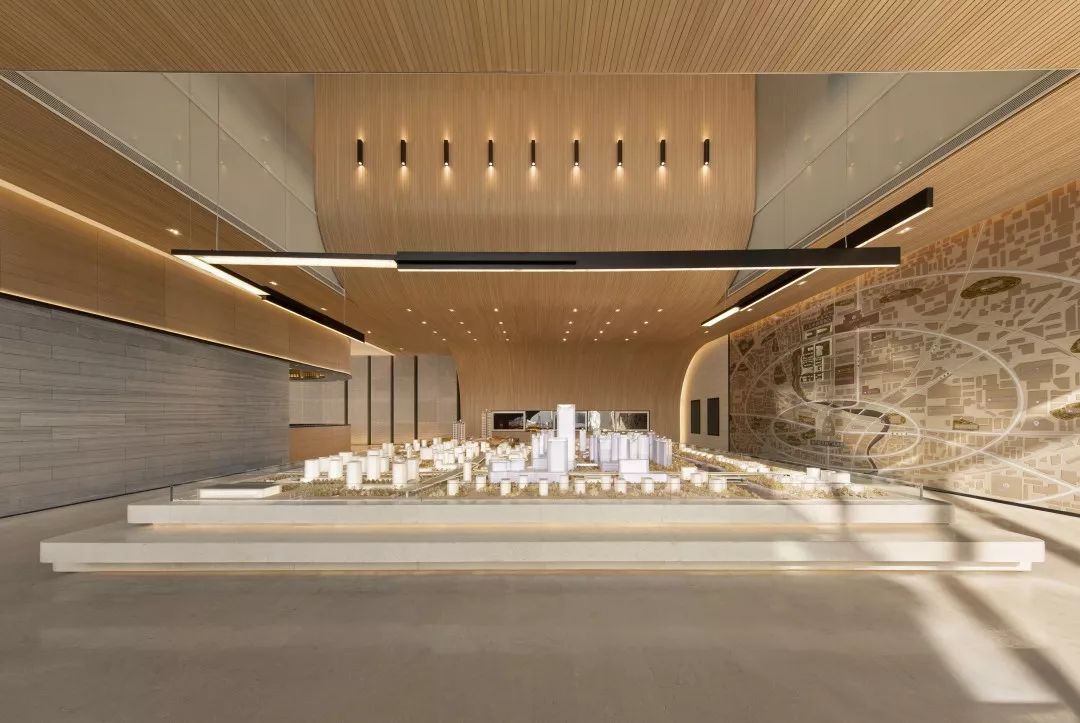 在大沙盘的上空,开有一个天窗,将自然光引入室内,可以丰富空间的光影层次,同时空间也会因为有光的进入而更加富有灵性。