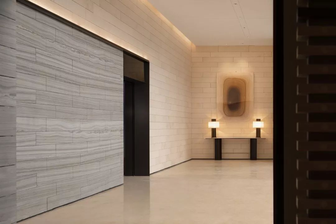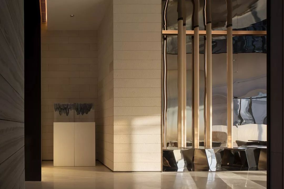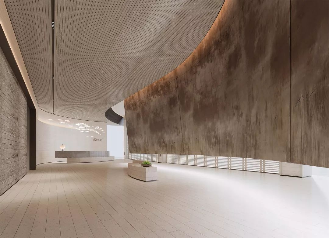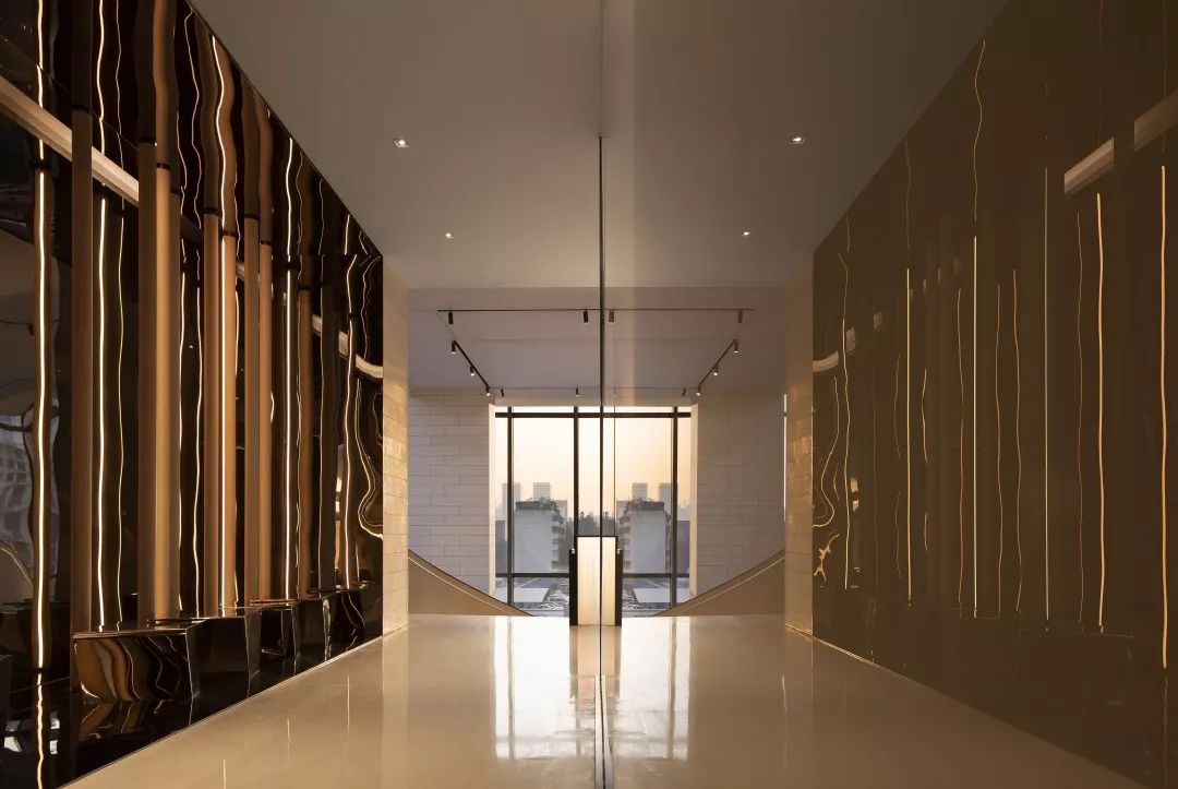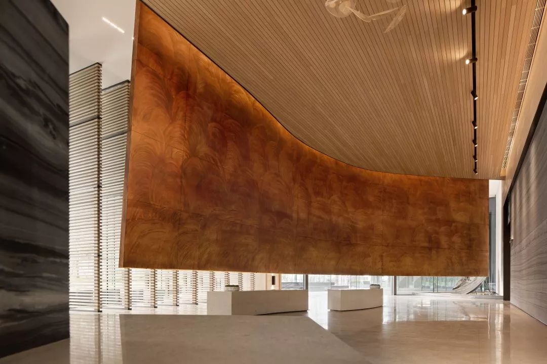室内空间设计上传递着现代风格简洁极致的细节美感,流露出独有的格调和艺术情怀。接待前厅,空间中用整块艺术铜板分割空间与动线,整体气质会相对更加硬朗,富有艺术馆的稳重大气的气质。