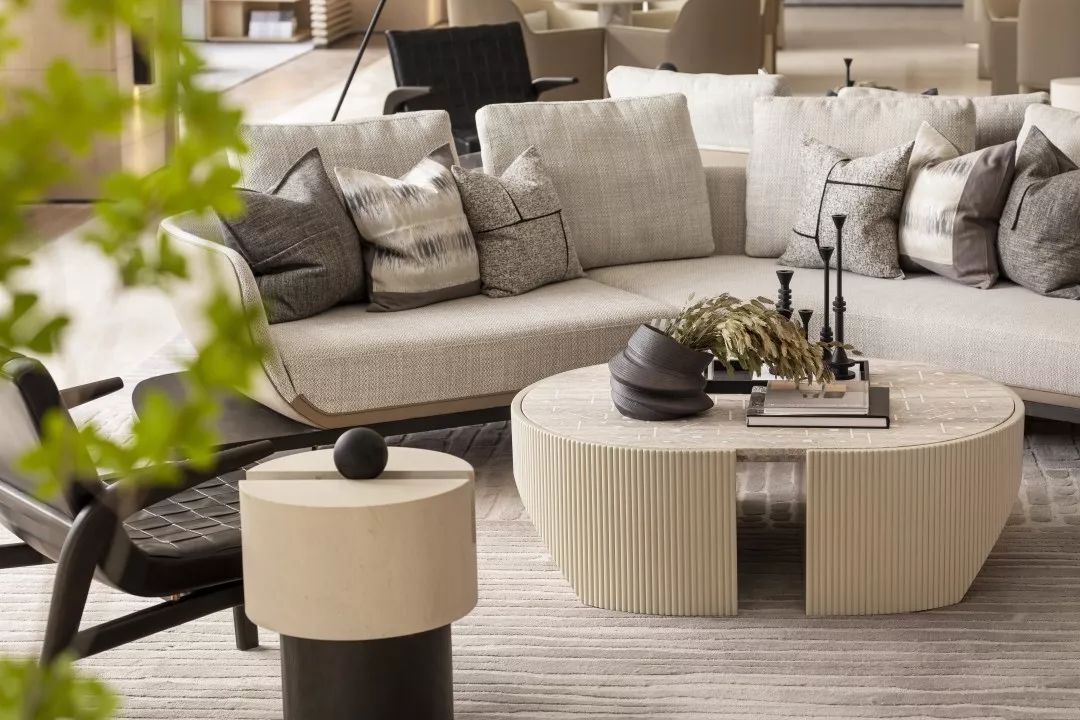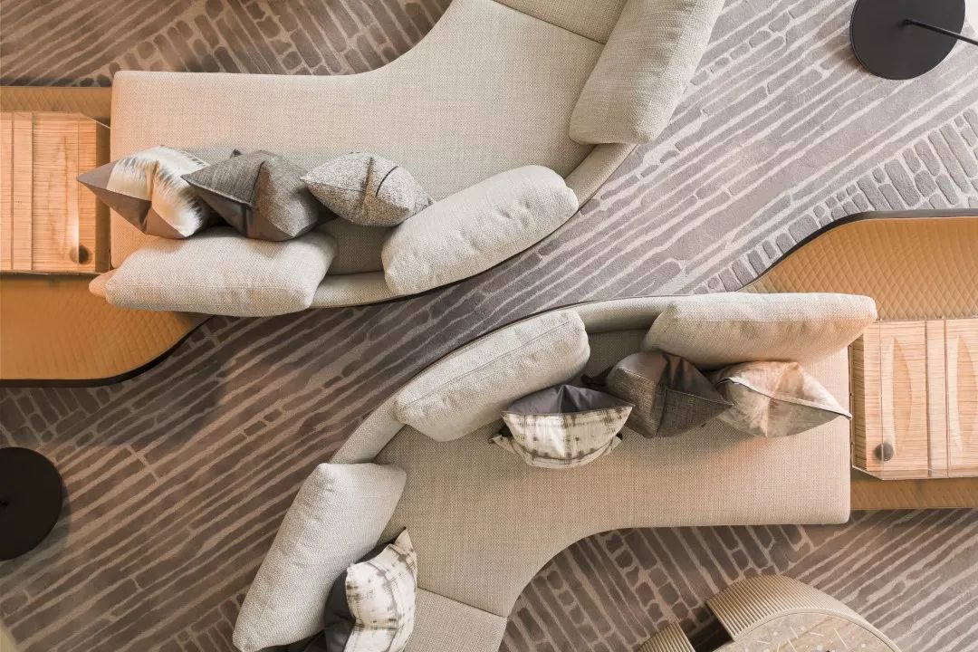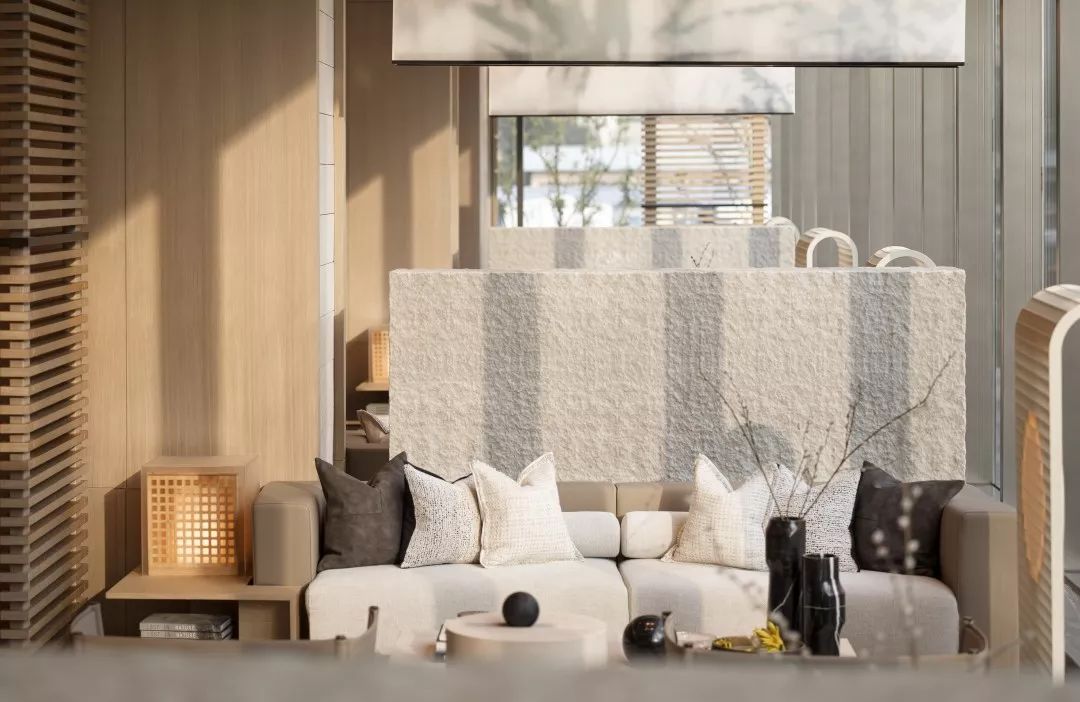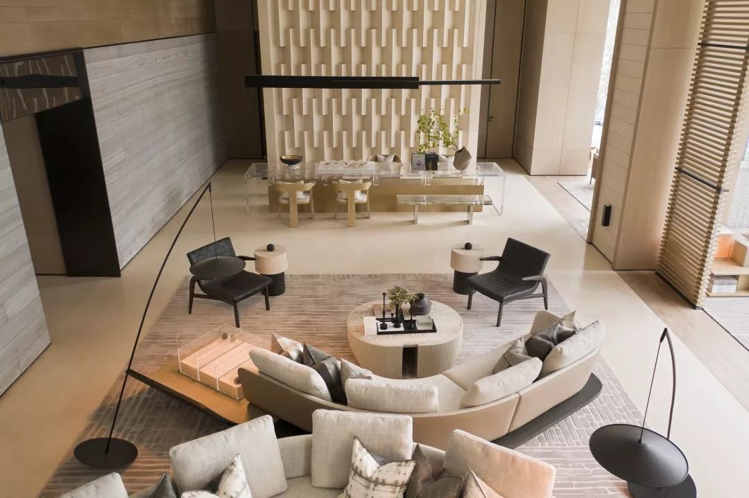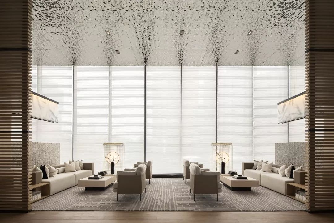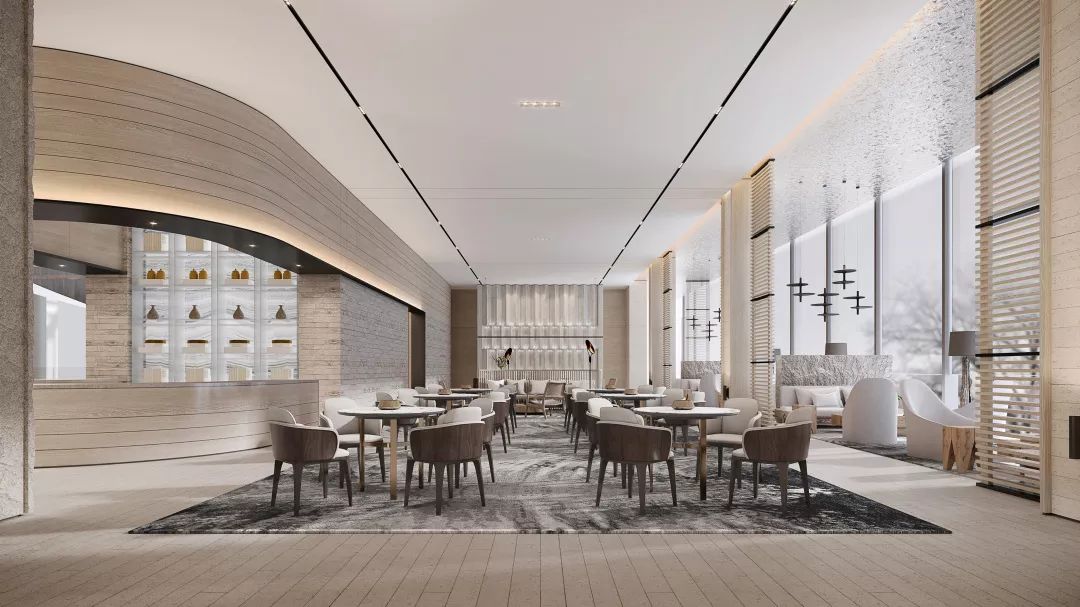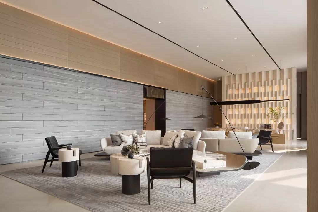 洽谈区,视点中心有一面错位变化的背景墙,配合灯光,能有一面非常立体的背景。靠近玻璃幕墙的洽谈区有非常好的景观面,靠玻璃幕墙的沙发之间采用毛面石材的隔断相隔开,能够形成不同材质表面直接的对比,增加空间的丰富性。
