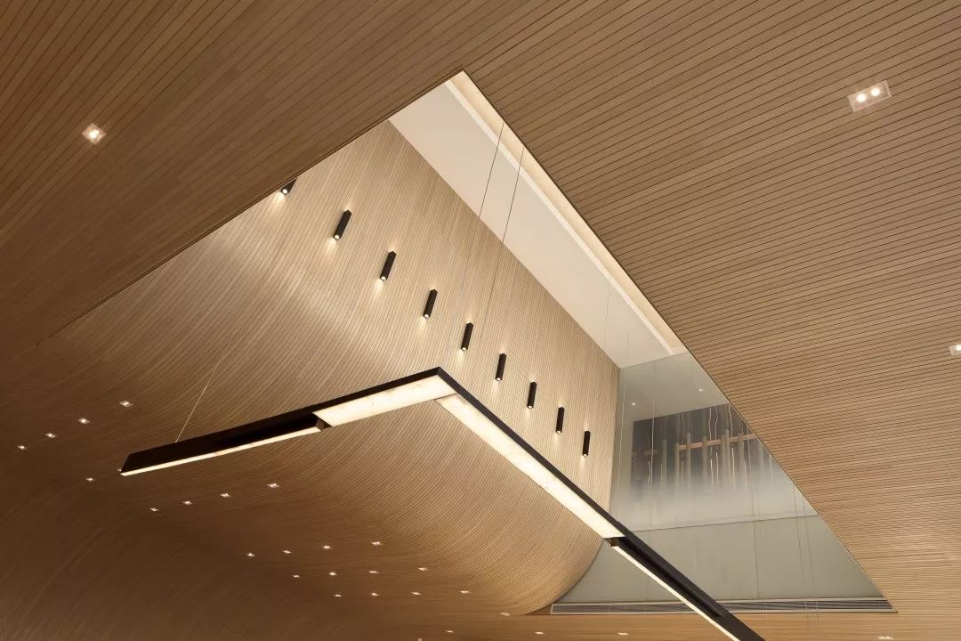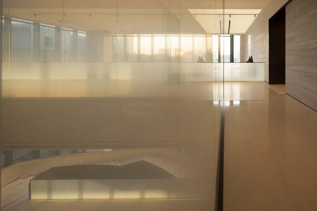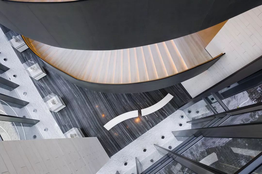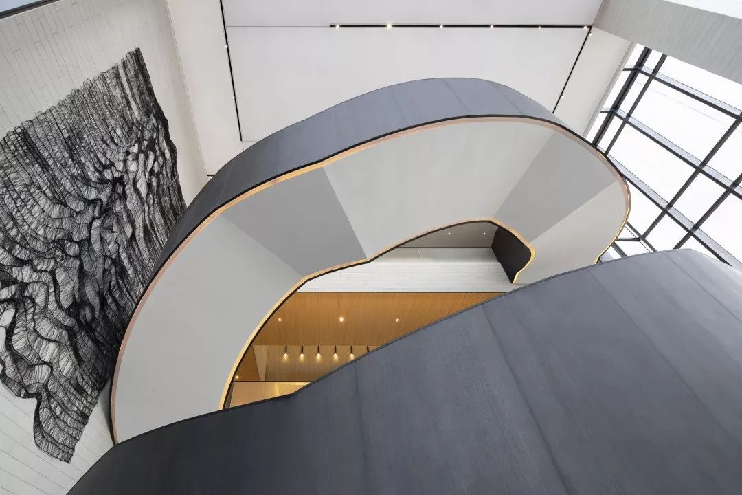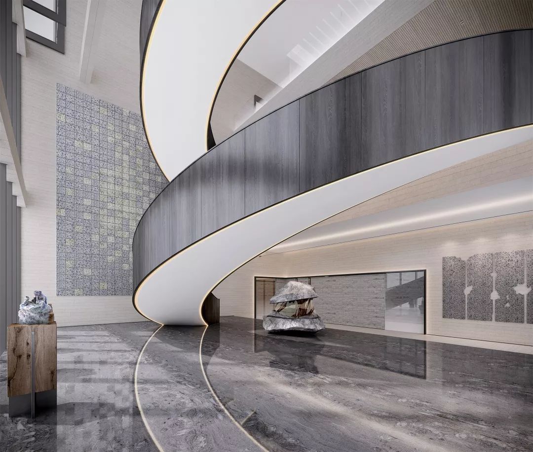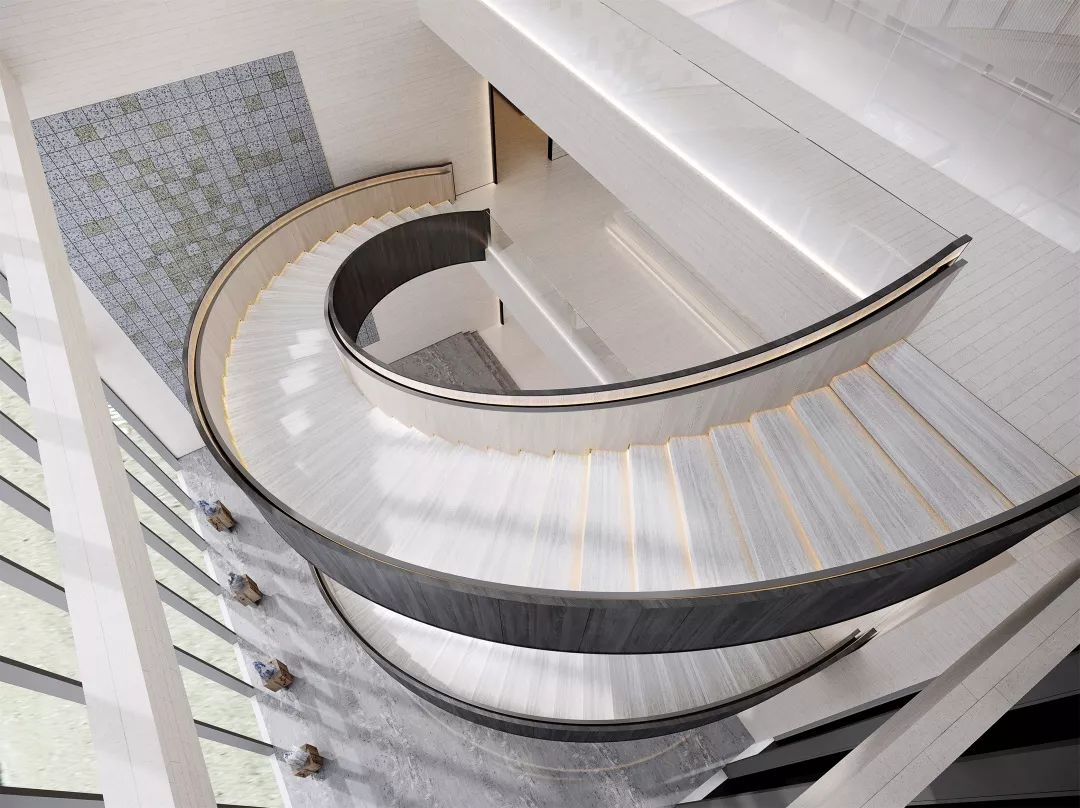 楼梯展示区,楼梯地面采用镜面处理的瓦尔斯大理石,大理石的纹路像水中的波纹,同时抬高的地面像是一个巨大的展台,衬托着双旋转楼梯这件巨型艺术品。 展台上与墙面上挂着的是艺术家的艺术作品:竹艺,艺树木无线生长的姿态,记录成都这块从木综厂到新的生成面貌的综合体的历史进程。楼梯上方天花是横竖分割的透光膜,空间光线柔和温馨,双弧形楼梯在顶面大面光源的牵引下,构成一股向上延伸的力量美感。