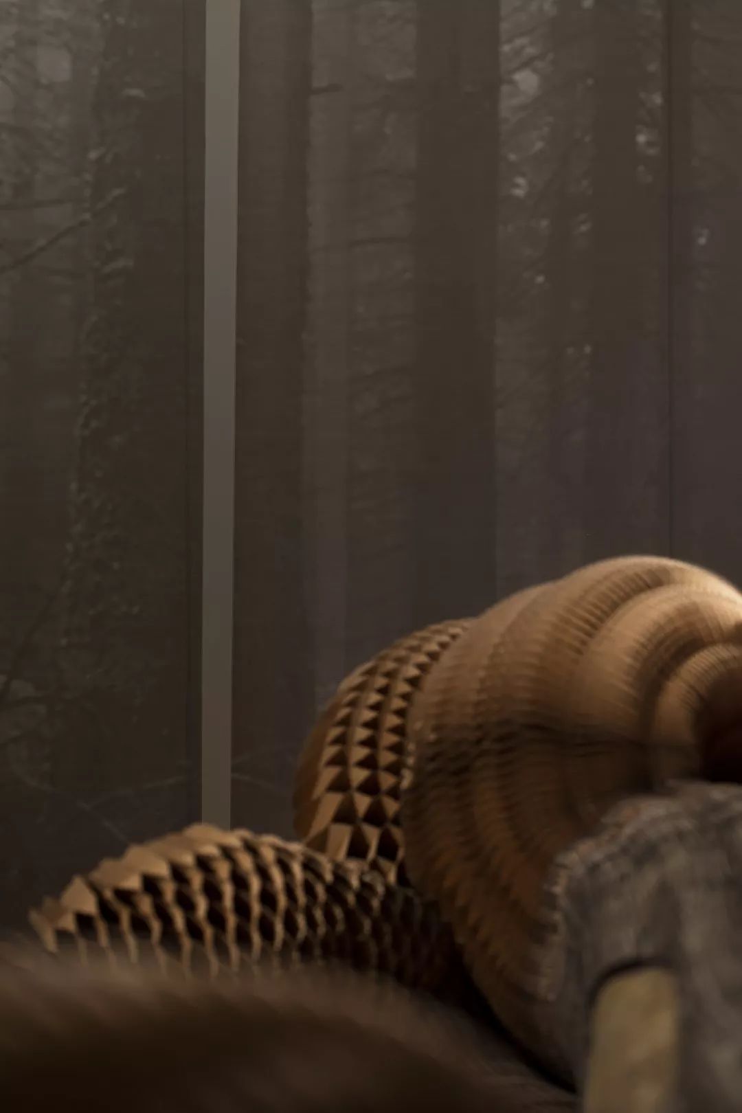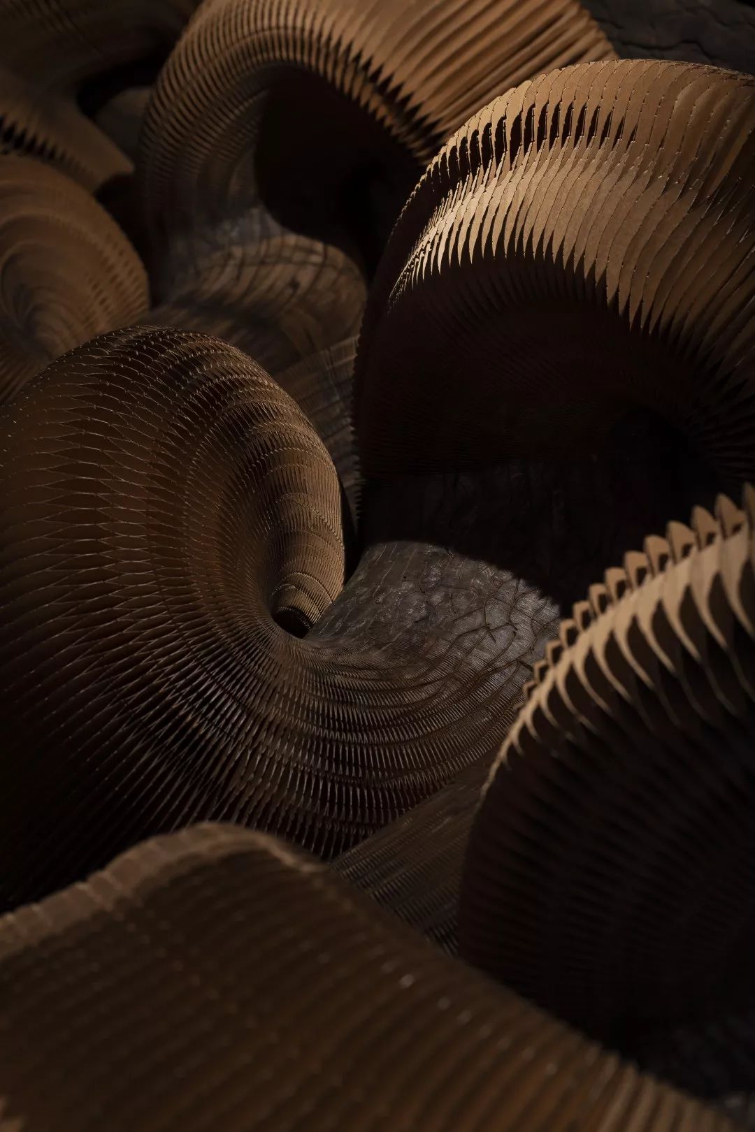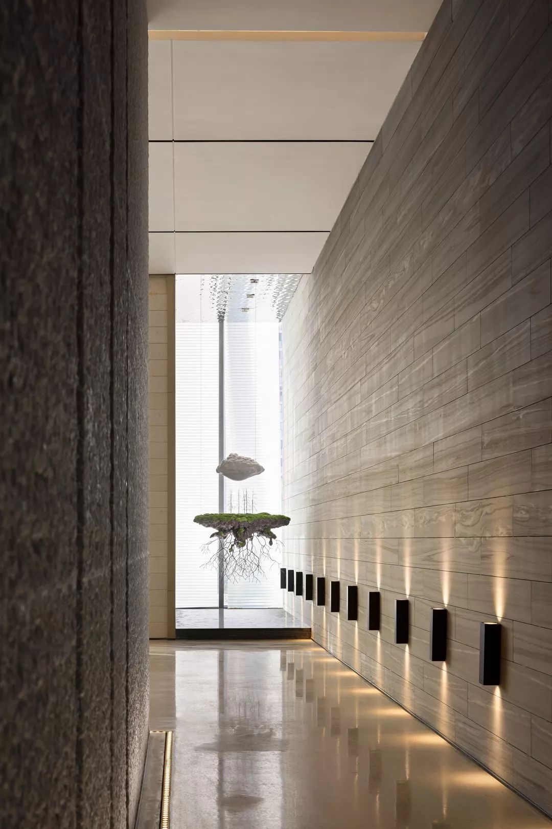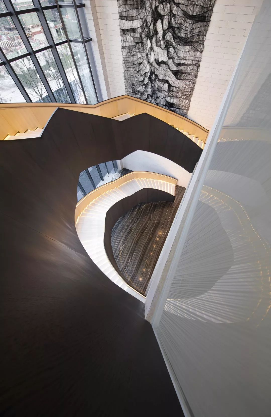 楼梯展示区,楼梯地面采用镜面处理的瓦尔斯大理石,大理石的纹路像水中的波纹,同时抬高的地面像是一个巨大的展台,衬托着双旋转楼梯这件巨型艺术品。 展台上与墙面上挂着的是艺术家的艺术作品:竹艺,艺树木无线生长的姿态,记录成都这块从木综厂到新的生成面貌的综合体的历史进程。楼梯上方天花是横竖分割的透光膜,空间光线柔和温馨,双弧形楼梯在顶面大面光源的牵引下,构成一股向上延伸的力量美感。