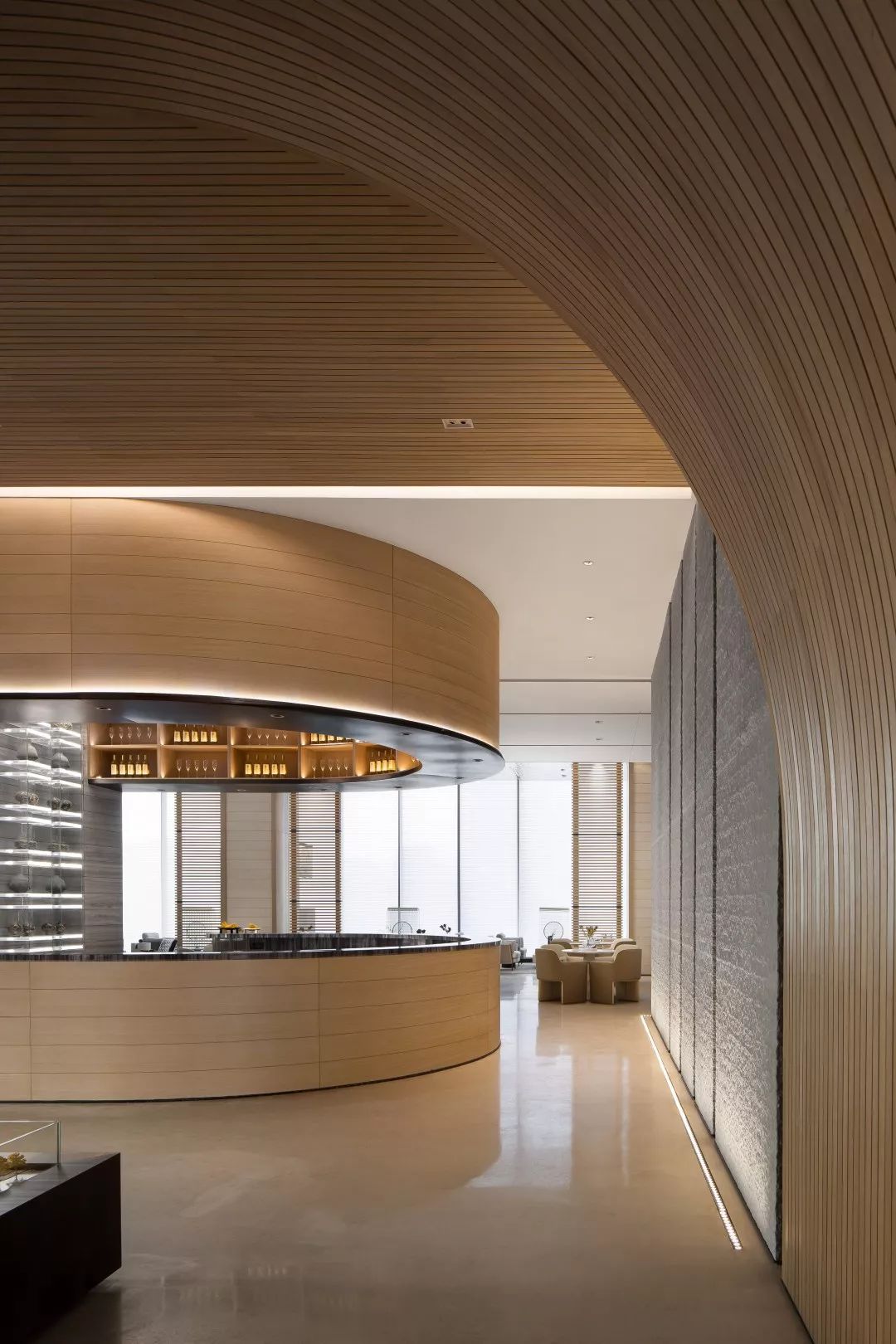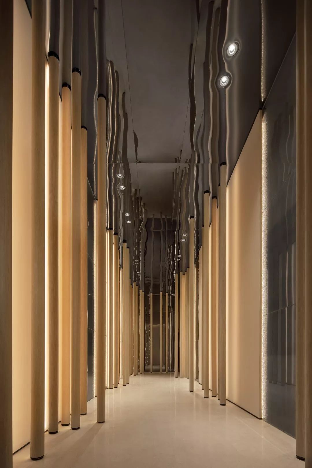 时光长廊,连接着过去与未来,竖向的木条是由整木车圆的木柱,柱身开槽藏光,光线从不同的方向在空间中投。末端的墙面与天花采用灰色镜面玻璃,把空间在视觉上拉远拉高。墙上还会有印有历史老图片的夹丝玻璃,在灯光的渲染下,形成一个有趣的场景转换空间。