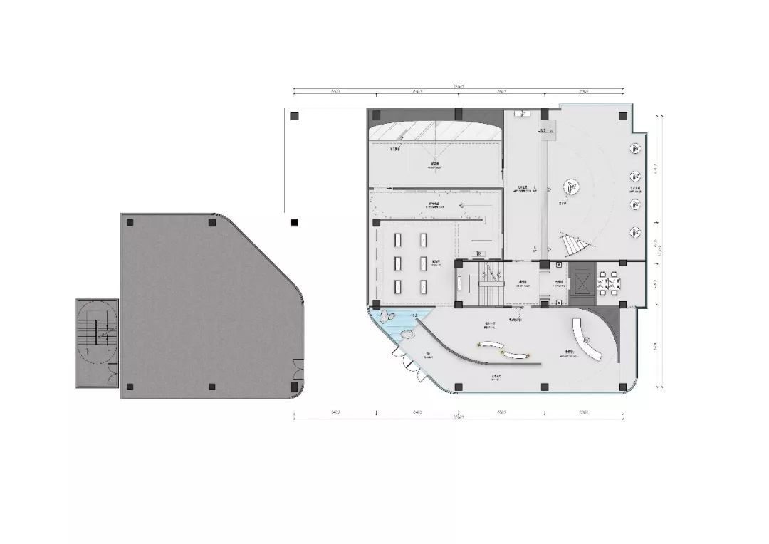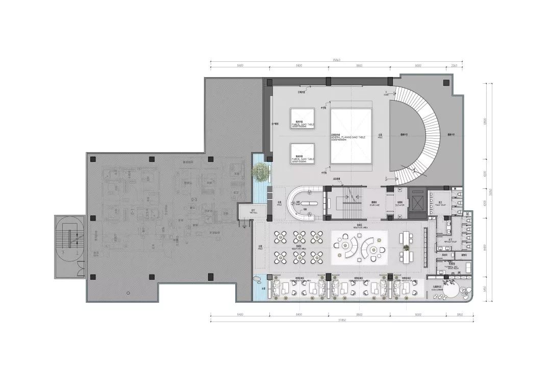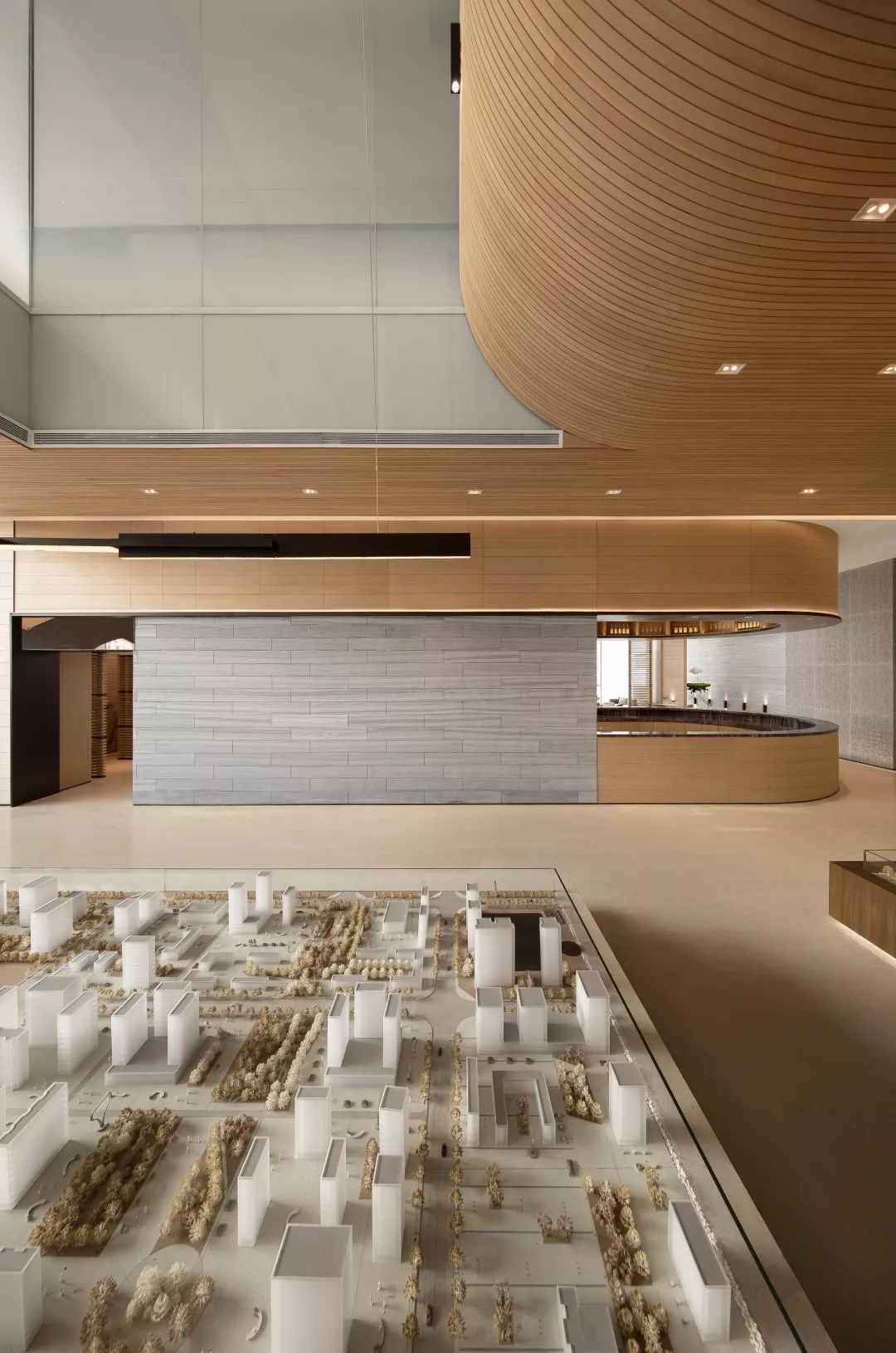 沙盘区,空间中可以看到一个贯穿着二层地面、二层墙面、三层墙面、三层天花的一个曲面。这个面打破了空间直接的独立关系,将之有机串联。使得整个沙盘区有一个向上延展的面。主要的设计目的是做体块、是一种内建筑的手法。