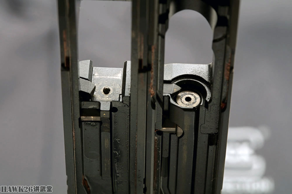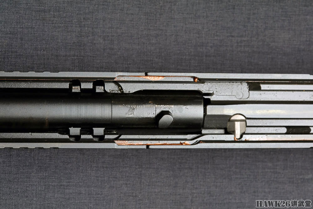 看一下枪管回转闭锁的定位槽,显示了枪管后部的凸笋在其中的行进路线。另外供弹坡就在这个部件上,确保弹药在进入弹膛之前只上升很小的高度。