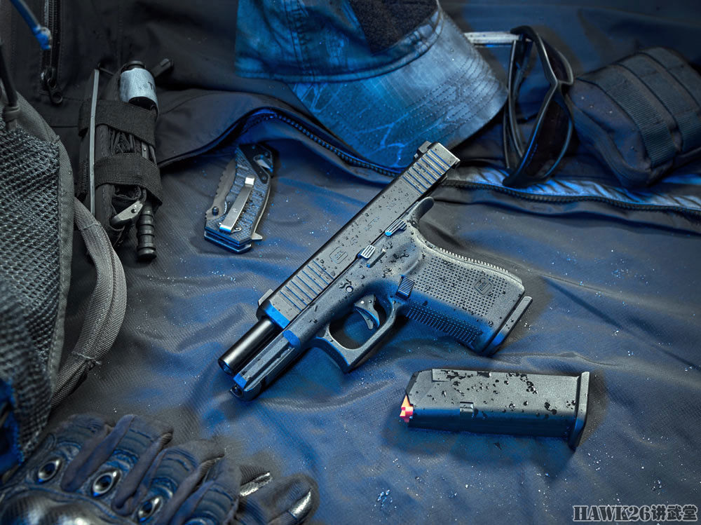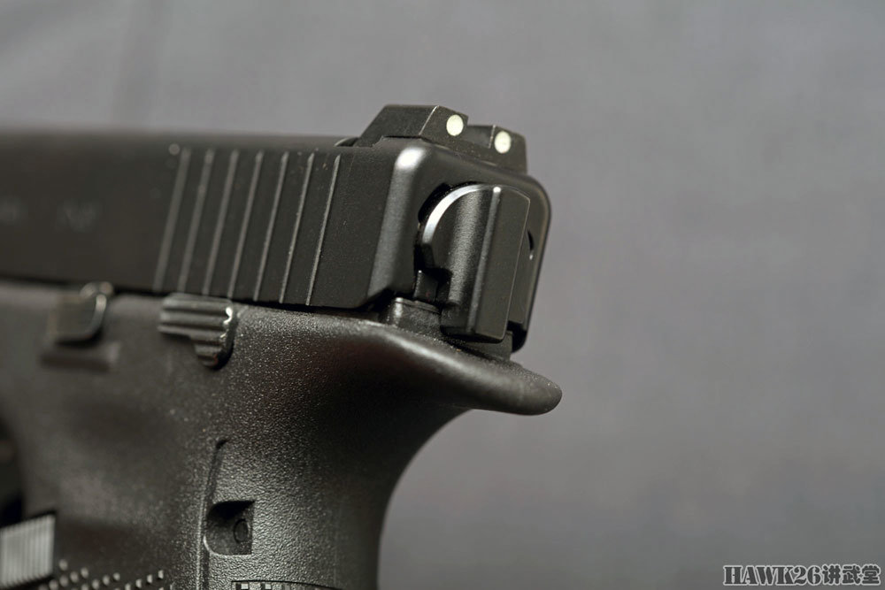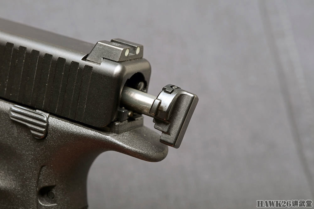 100mm长的GMB枪管同样与第五代相同,可以有效提升射击精度。第四代格洛克之前的所有击针都是独特的矛形,现在已经被圆形击针取代。测试样枪配备了带发光点的金属瞄准具,与标准格洛克的聚合物瞄准具有所区别。
