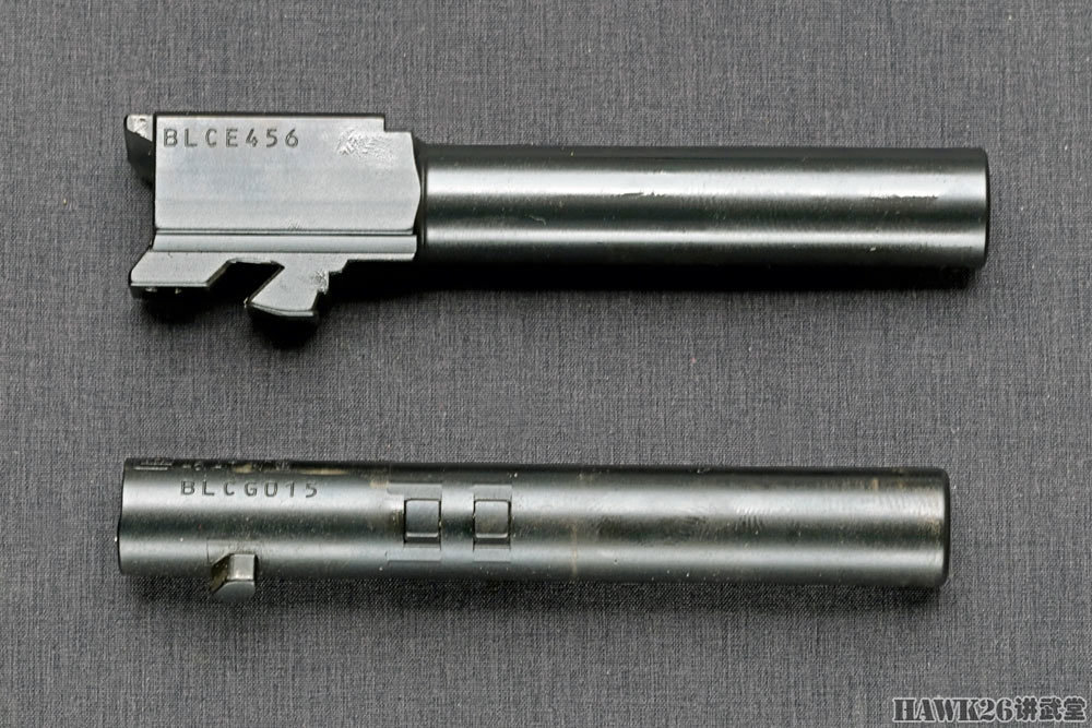 格洛克19枪管(上)、格洛克46枪管(下),格洛克46的枪管上有三排六个凸笋。